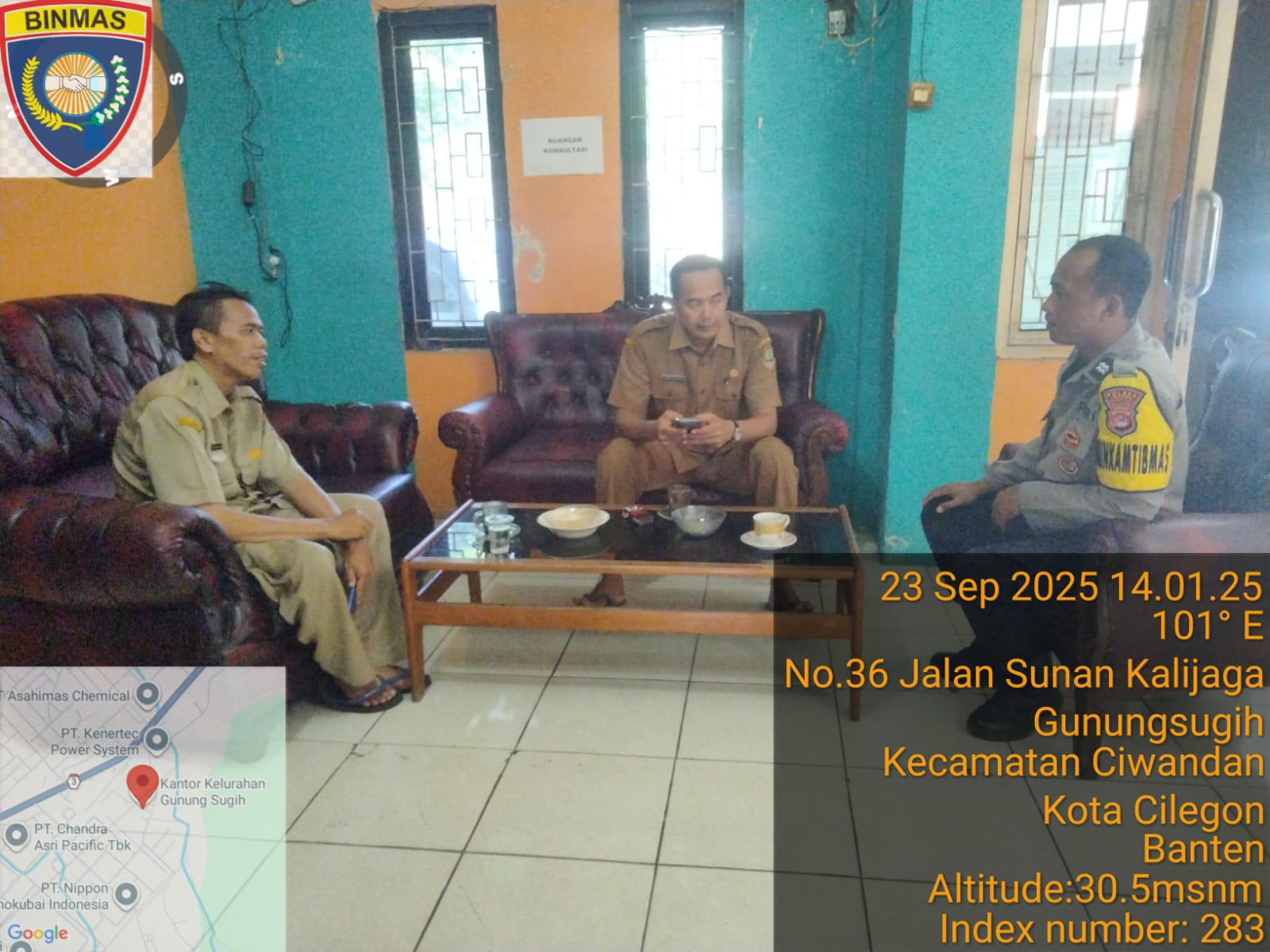 Cilegon - Kali ini Bhabinkamtibmas Kelurahan Gunung Sugih Polsek Ciwandan Polres Cilegon Polda Banten AIPTU Tri Widodo melaksanakan kegiatan sambang Dialogis Dan silaturahmi Bersama Lurah Dan Staff Kelurahan Gunung Sugih Kecamatan Ciwandan Kota Cilegon,Selasa (22/09/2025).