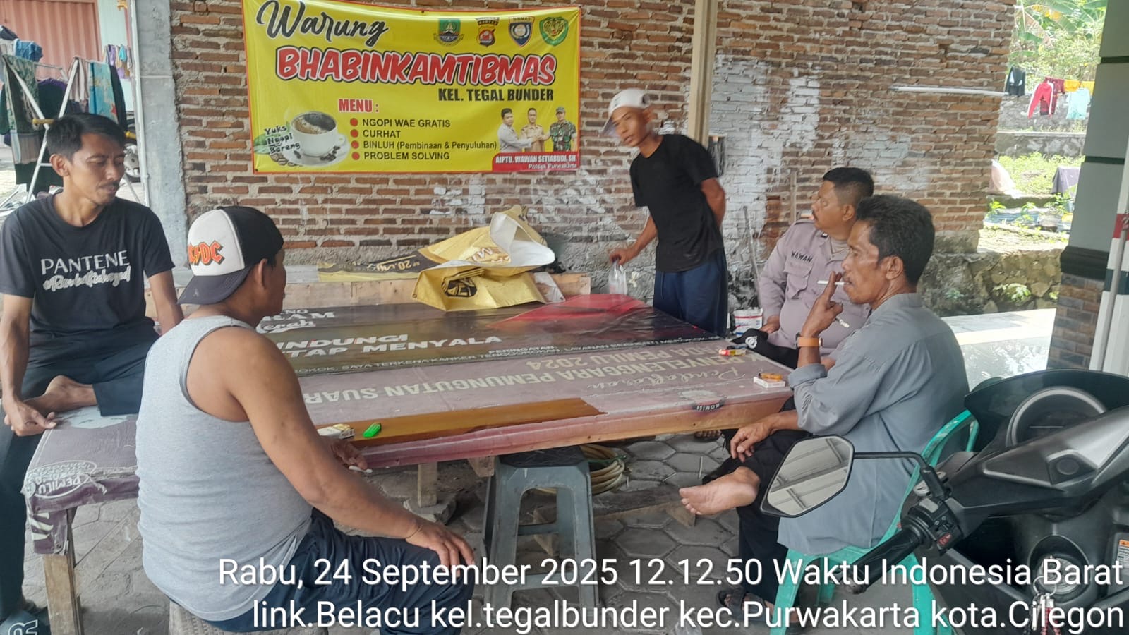 -POLRES CILEGON- Polda Banten. Dalam Rangka Menjalin silaturahmi Masyarakat dan Bhabinkamtibmas Aiptu Wawan setiabudi Ngobrol santai Menerima kunjungan Masyarakat santai ngobrol asik bersama warga mendengarkan keluh kesah Masyarakat di Warung Kopi Bhabinkamtibmas merupakan terobosan supaya dekat dengan Masyarakat di Link. Blacu Kelurahan Tegalbunder Kecamatan Purwakarta Kota Cilegon.Rabu.(24-09-2025).