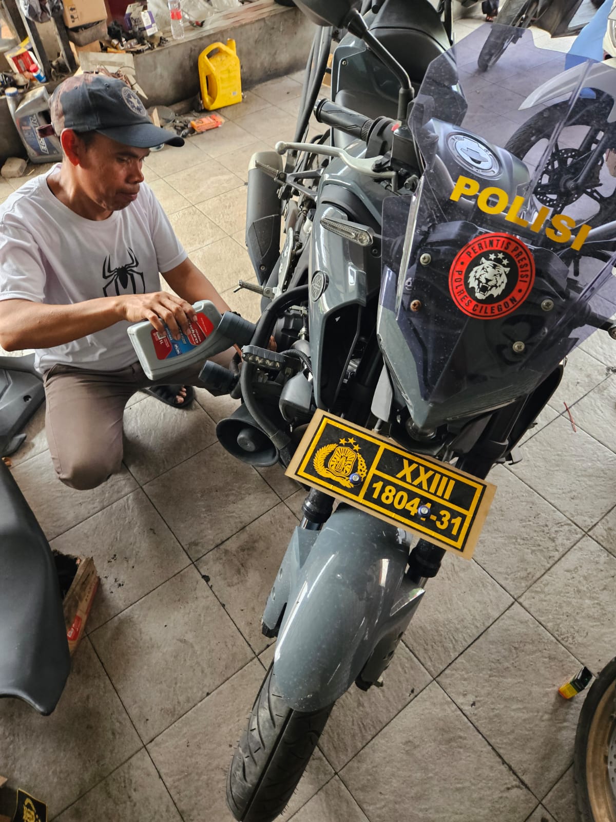 Cilegon Polres cilegon Polda Banten Staf Logistik melakukan pengecekan perawatan kendaraan dinas roda 2 yang sedang di lakukan perawatan.