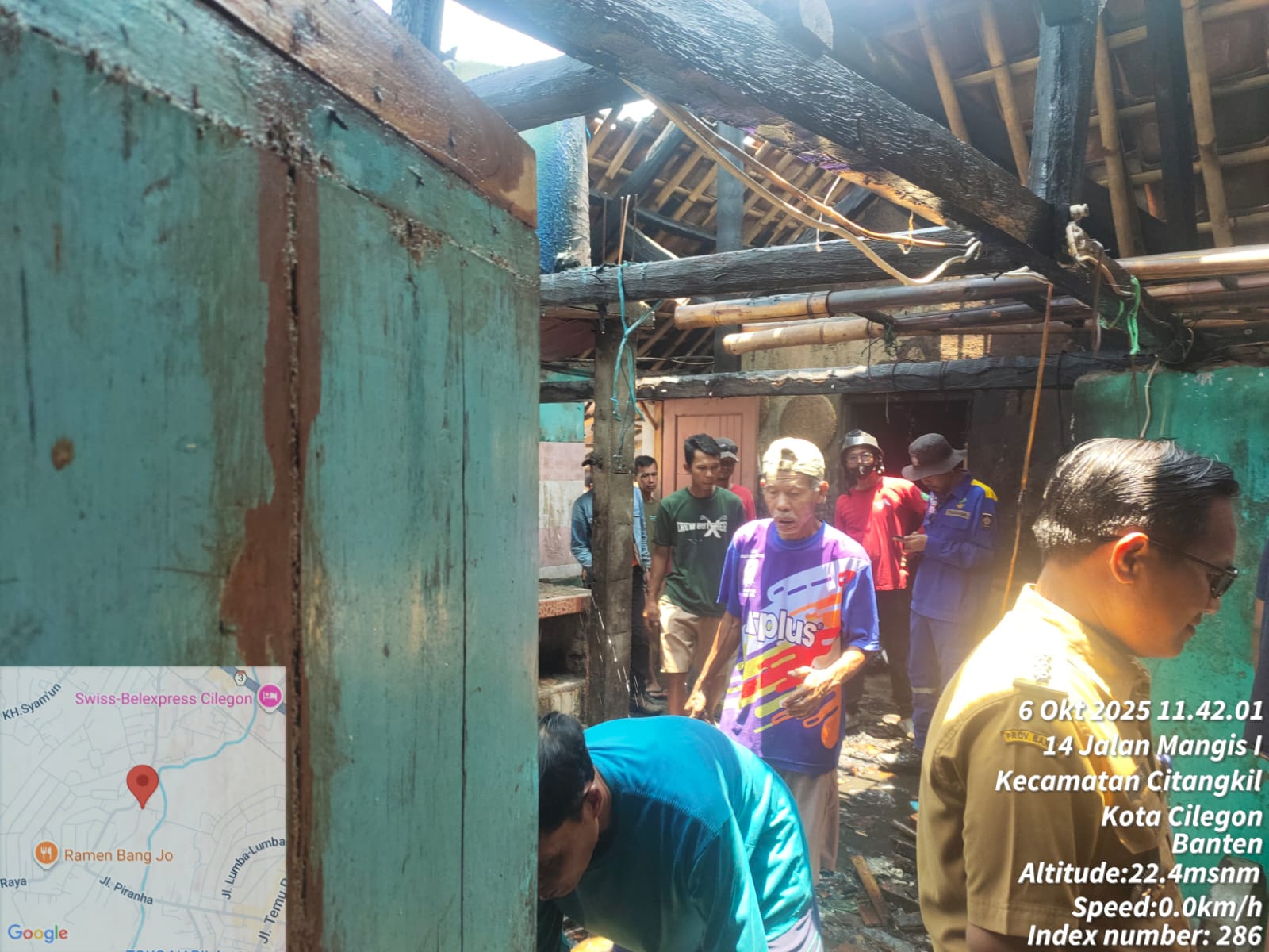 Cilegon - Polsek Ciwandan merespons cepat kebakaran warung dan dapur rumah milik Sdri. Mas'ah di Link Tegal Cabe, Kelurahan Citangkil, Kecamatan Citangkil, Kota Cilegon, pada Senin, 6 Oktober 2025. Api berhasil dipadamkan setelah tiga unit mobil pemadam kebakaran tiba di lokasi,Senin (06/10/2025).