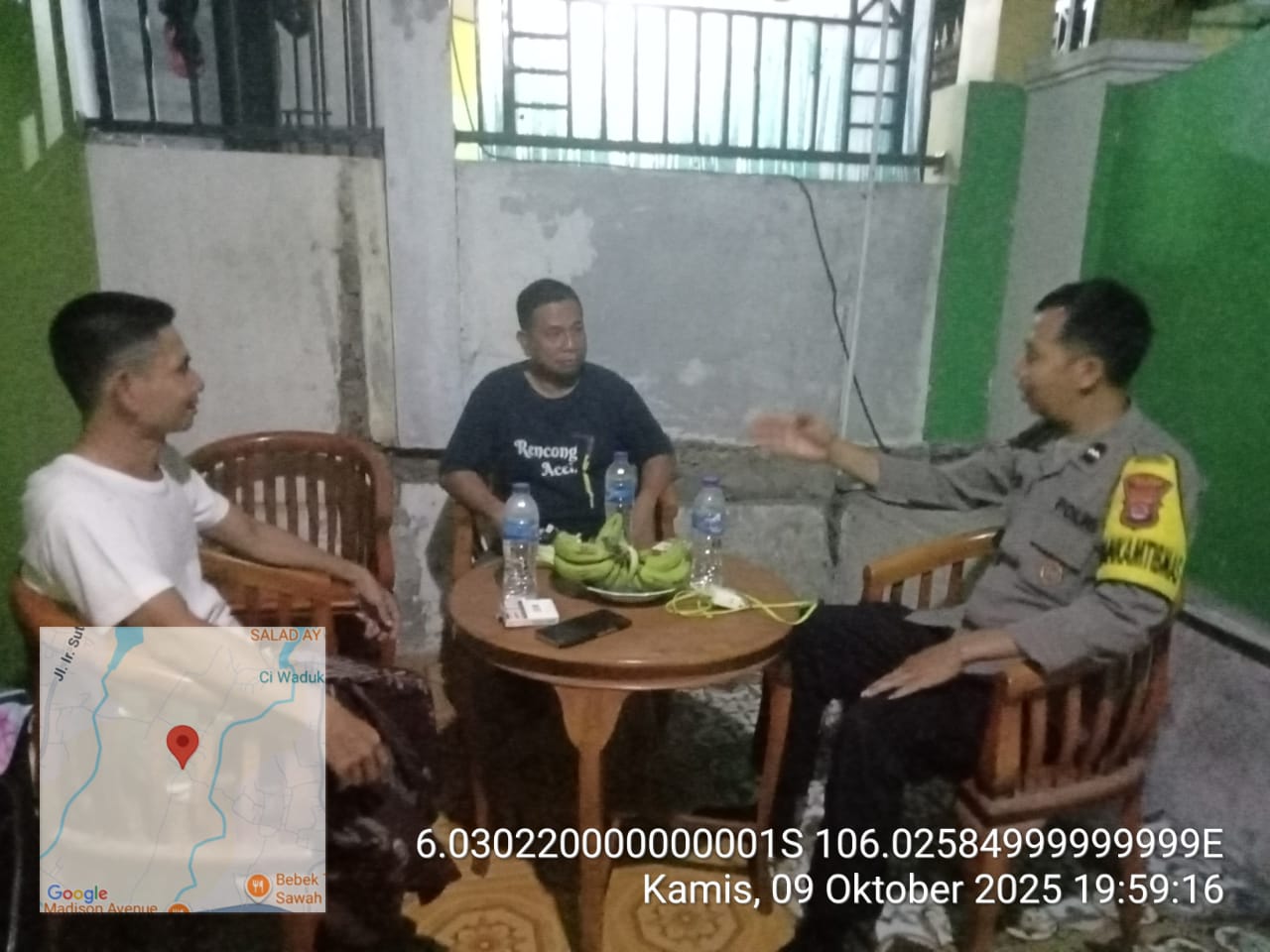 Cilegon - Upaya mengantisipasi aksi kejahatan pada daerah binaan dan memberikan rasa aman dan nyaman kepada warga binaan, Bhabinkamtibmas Polsek Ciwandan Polres Cilegon Polda Banten sambangi warga pada malam hari, Jum’at (10/10/2025).