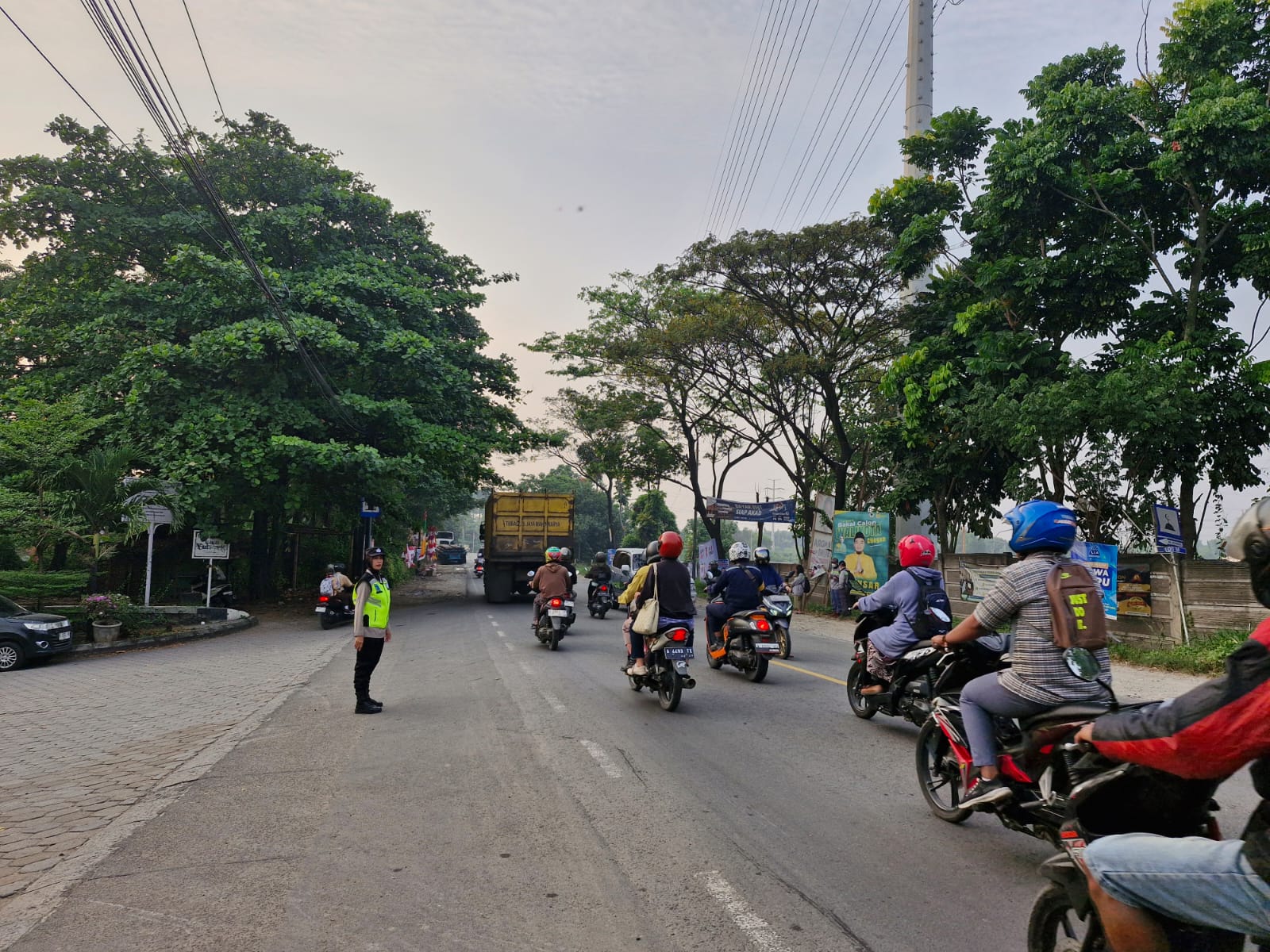 Cilegon,Polres Cilegon Polda Banten Pada Senin/13/07/2025 Pukul 06.30 Wib, Personil Siwas Polres Cilegon, Aipda Emi Prasetyo melaksanakan kegiatan pengaturan arus lalu lintas di Jalur Protokol jalan utama Kota Cilegon tepat nya di jalur depan perumahan arga baja Pura Kota Cilegon.