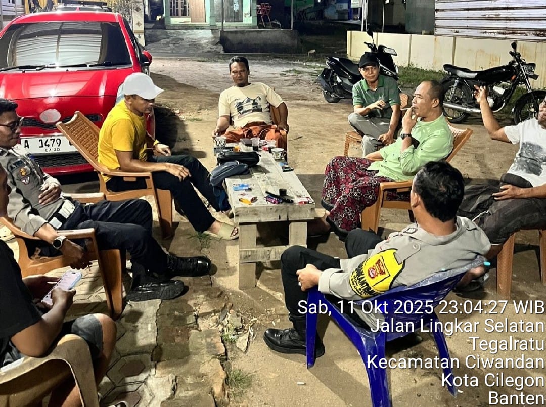 Cilegon - Bhabinkamtibmas Polsek Ciwandan Polres Cilegon Polda Banten Melaksanakan Patroli Kunjungan Malam dan terus memberikan pembinaan dan penyuluhan tentang pentingnya menjaga kamtibmas di daerah hukum Polsek Ciwandan Polres Cilegon Polda Banten, Minggu (12/10/2025).