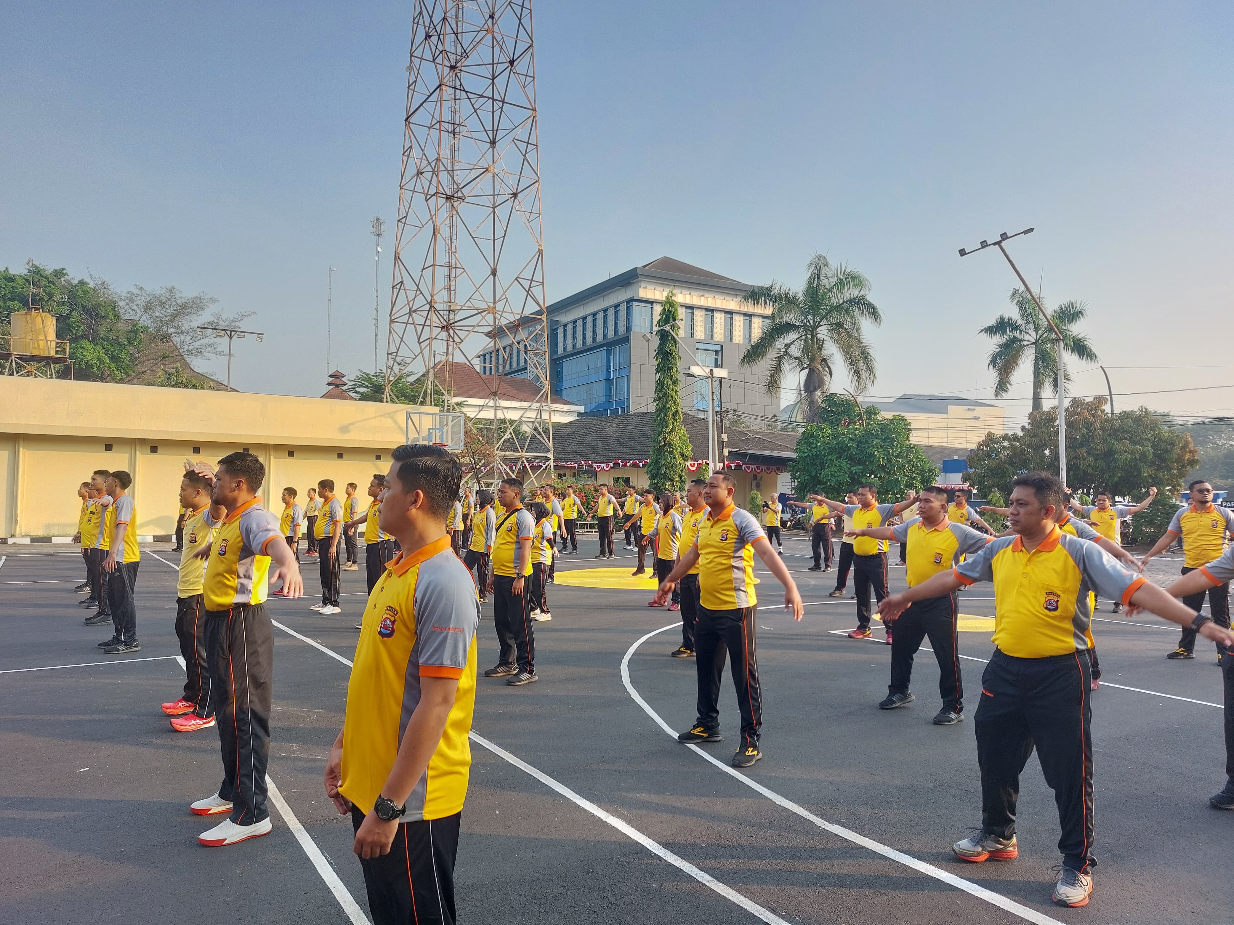 Cilegon,Polres Cilegon Polda Banten Pada Jumat/17/10/2025 Pukul 07.15 Wib, Personil  Polres Cilegon, melaksanakan kegiatan olahraga mandiri di lapangan Polres Cilegon dan melaksanakan senam aerobik di Lapangan polres cilegon.