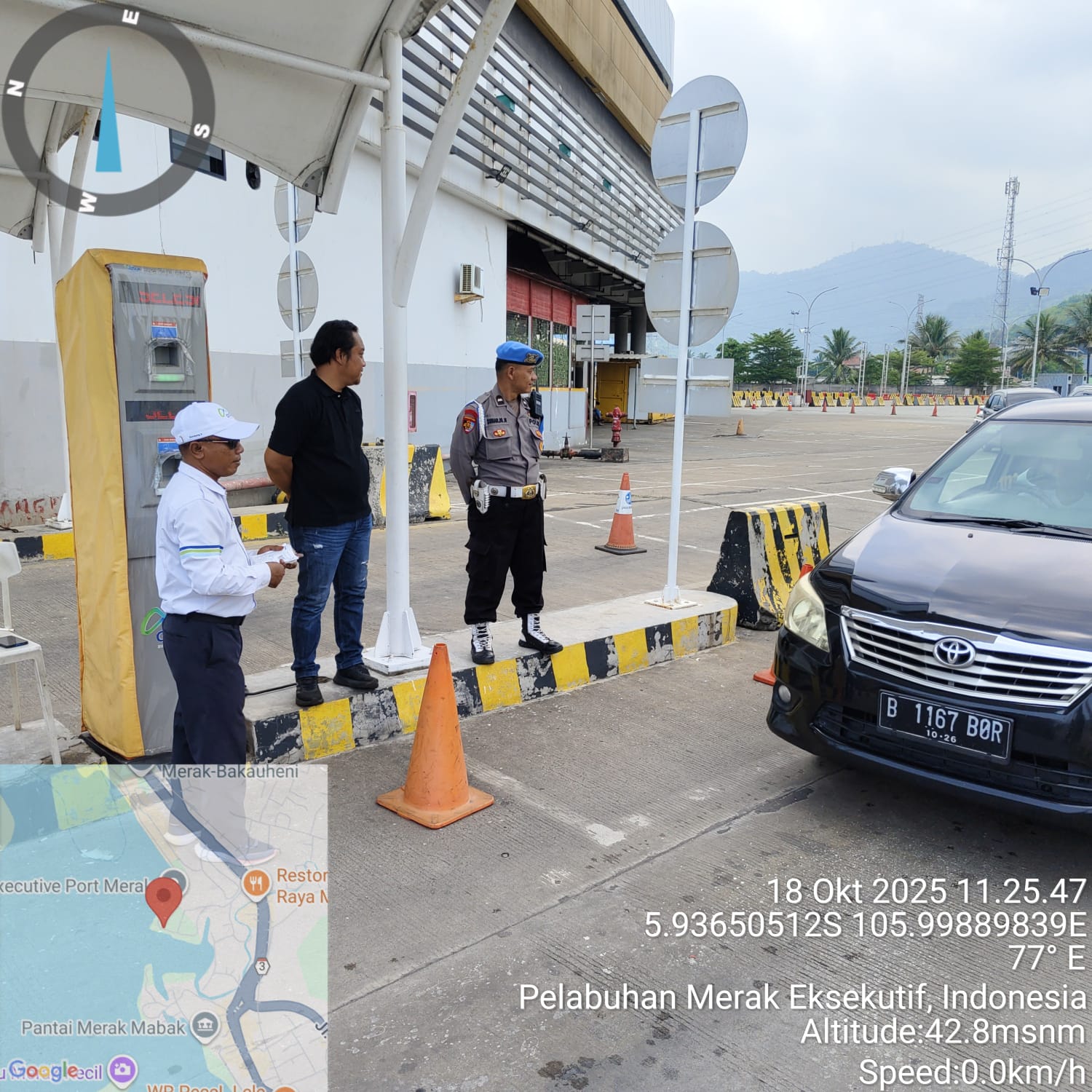 Cilegon - Personel Polsek Kskp Merak Polres Cilegon Polda Banten melaksanakan sambang dan patroli kawasan pelabuhan merak dalam rangka menjaga Harkamtibmas di Kawasan Pelabuhan Merak, Sabtu (18/10/2025).