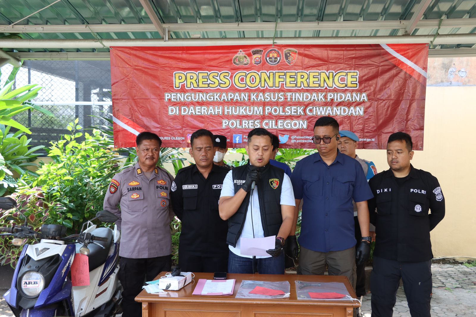 IPDA Muhamad Suharya  S.H. selaku Panit 2 unit Reskrim Polsek Ciwandan Polres Cilegon Polda Banten menjelaskan pada saat press confrence pelaku pencurian sepeda motor sudah melakukan aksinya sudah berulang kali dan baru kali ini ditangkap,pelaku A (32) Kp. Nagreg Ds. Siketug Kec. Ciomas Kab. Serang.