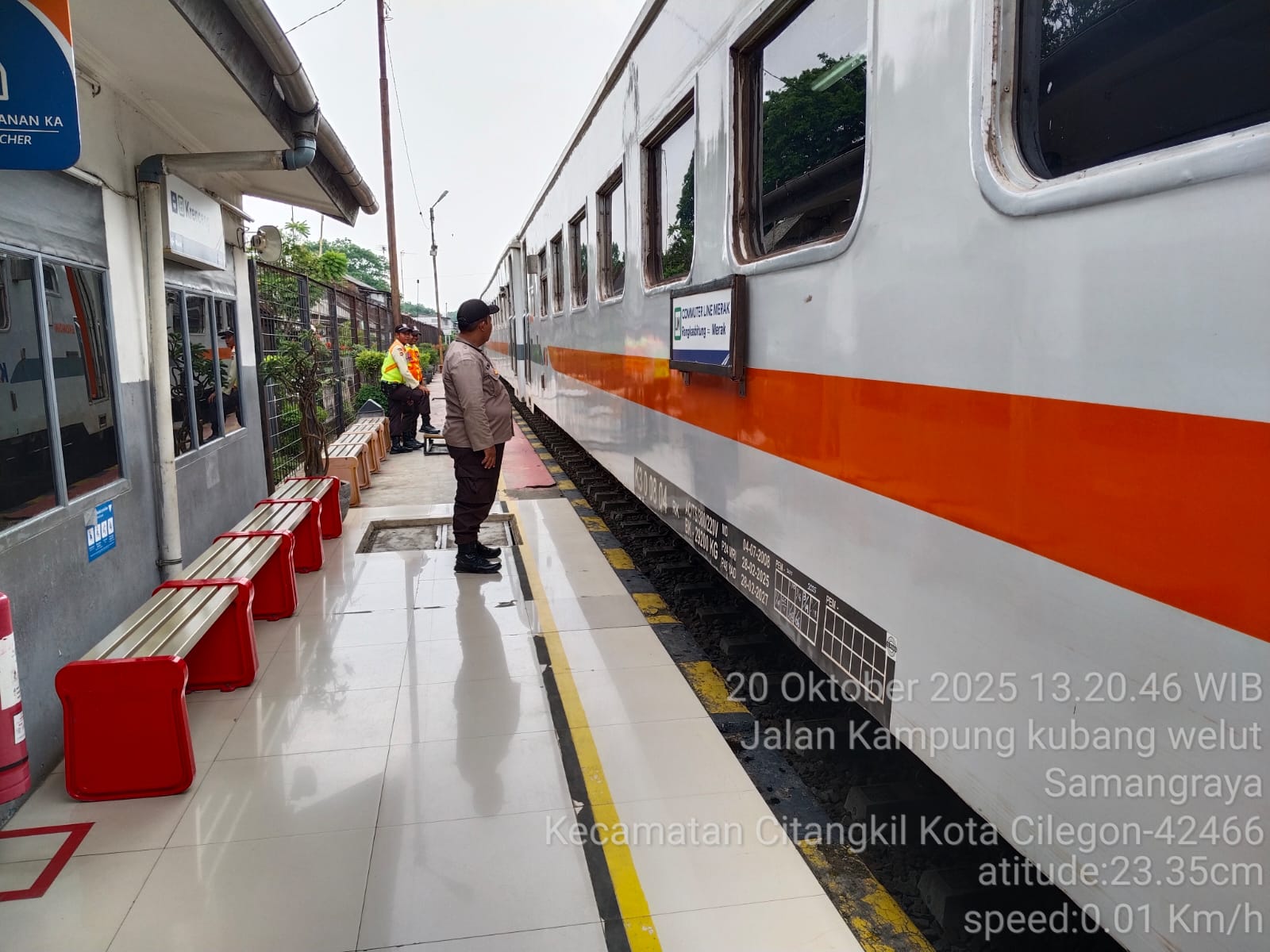 Cilegon - Personil Polsek Ciwandan Polres Cilegon Polda Banten melaksanakan giat patroli Dan dengan sambangi Petugas Stasiun Kereta Api dan penjaga pintu perlintasan kereta api, Senin (20/10/2025).
