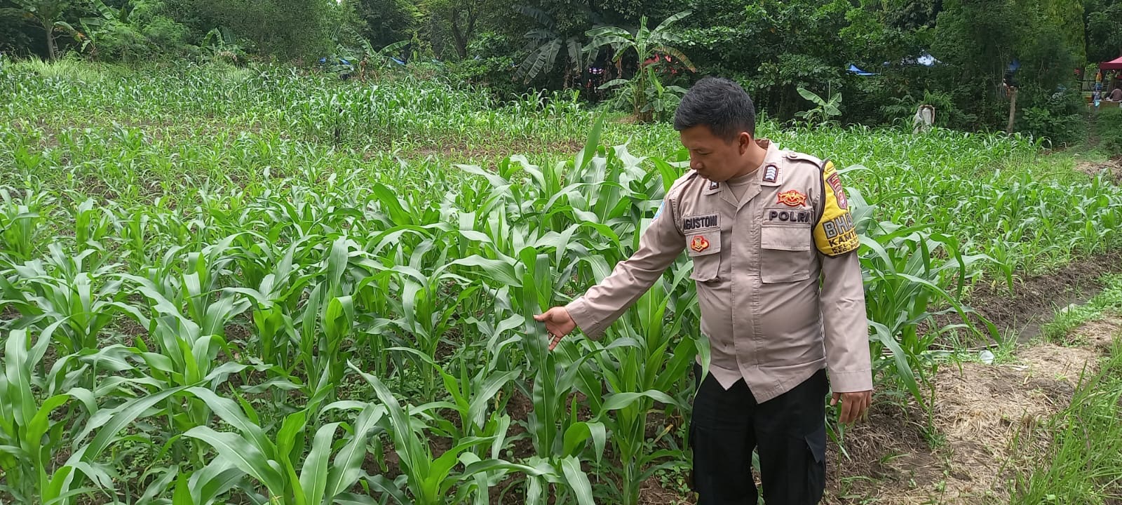 Bripka Agustoni, Babinkamtibmas Kelurahan Kotabumi, Kecamatan Purwakarta, Kota Cilegon, melaksanakan pengecekan rutin terhadap tanaman jagung di wilayah binaannya