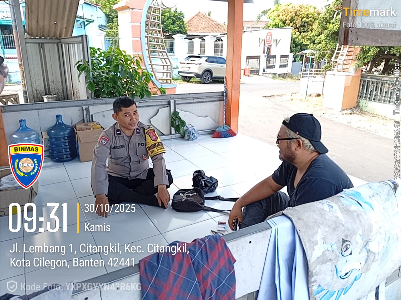 Cilegon - Personil Bhabinkamtibmas Polsek Ciwandan Polres Cilegon Polda Banten Menyampaikan Pesan Kamtibmas dan mengajak masyarakat terus aktif dalam kepedulian terhadap Pemeliharaan keamanan lingkungan di daerah Binaanya, Kamis (30/10/2025).