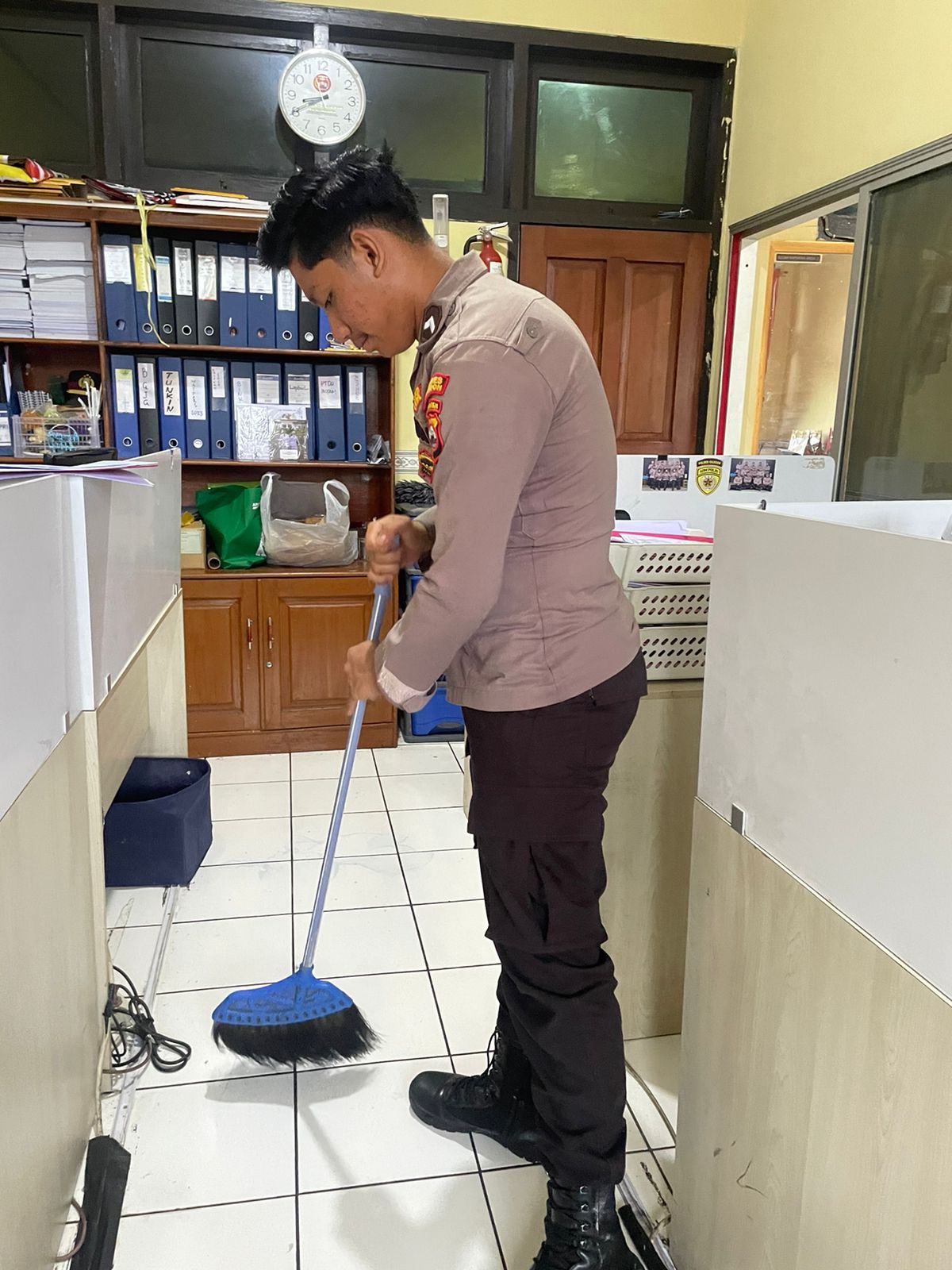 Anggota Bag SDM Polres Cilegon, Akivitaas dalam pelaksanaan membersihkan ruangan menjadi kegiatan aktif setiap hari.