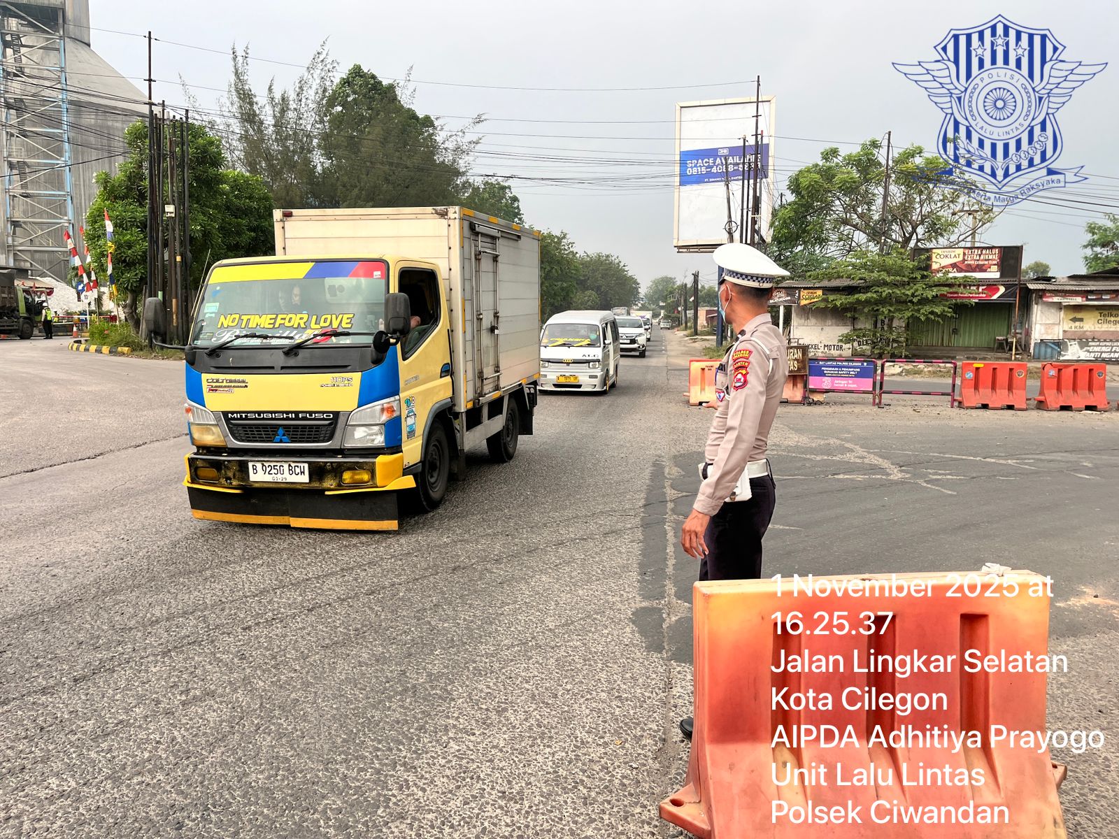 Cilegon - Personil Unit Lantas Polsek Ciwandan Polres Cilegon Polda Banten melaksanakan kegiatan monitoring jalur wisata di depan Pos Lantas JLS Ciwandan, Sabtu, (01/11/2025).
