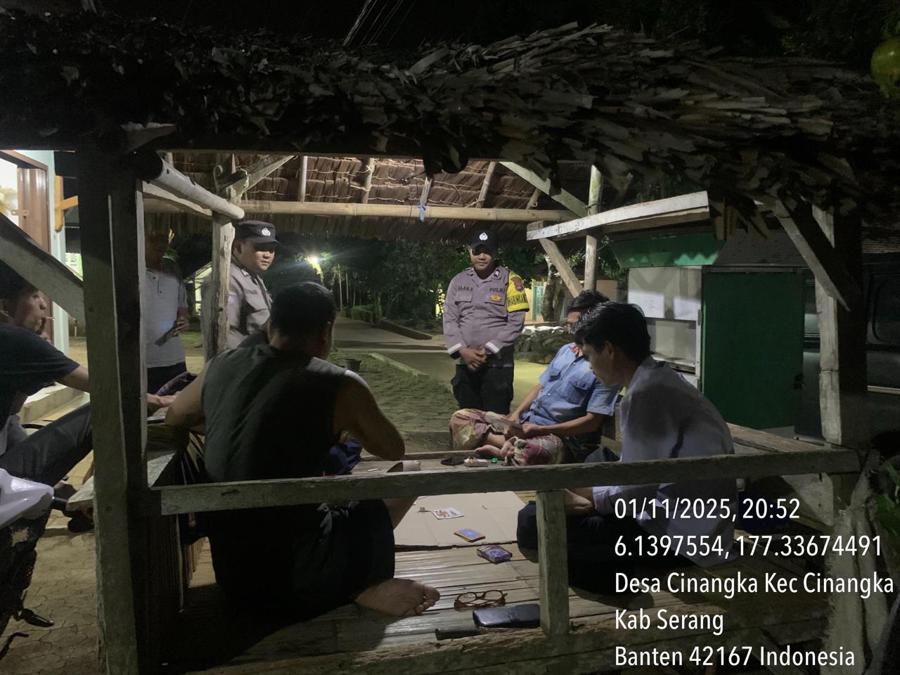 *Polres Cilegon* || Personel Bhabinkamtibmas Polsek Cinangka melaksanakan Program Komandan Wish Kapolda Banten RONDA SATKAMLING menyampaikan komunikasi dengan Petugas Siskamling agar berperan aktif dalam menciptakan Harkamtibmas yang aman dan Kondusif, Minggu (02/11/2025).