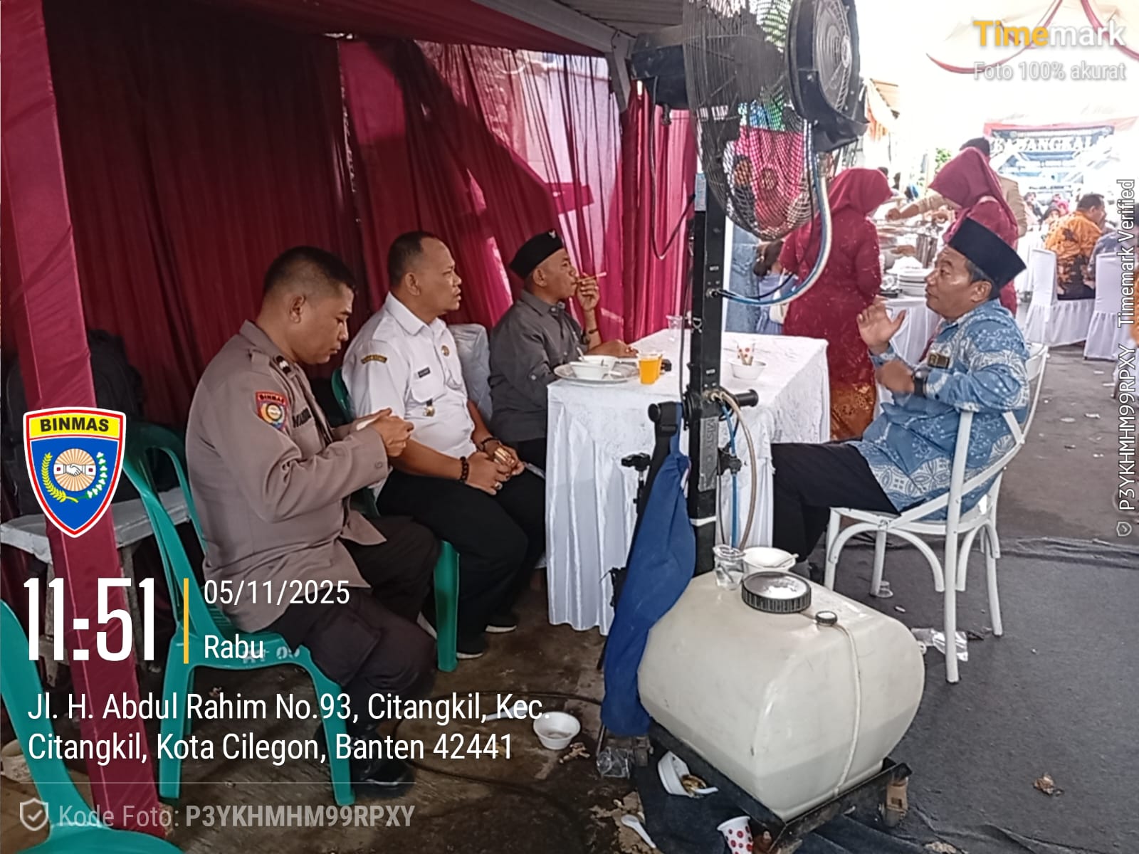 Cilegon - Bhabinkamtibmas Polsek Ciwandan Polres Cilegon Polda Banten melaksanakan Kegiatan Kondangan/Undangan ini bertujuan untuk memastikan acara berlangsung dengan aman dan tertib, serta memberikan rasa aman kepada warga yang menghadiri resepsi pernikahan tersebut, Rabu (05/11/2025).