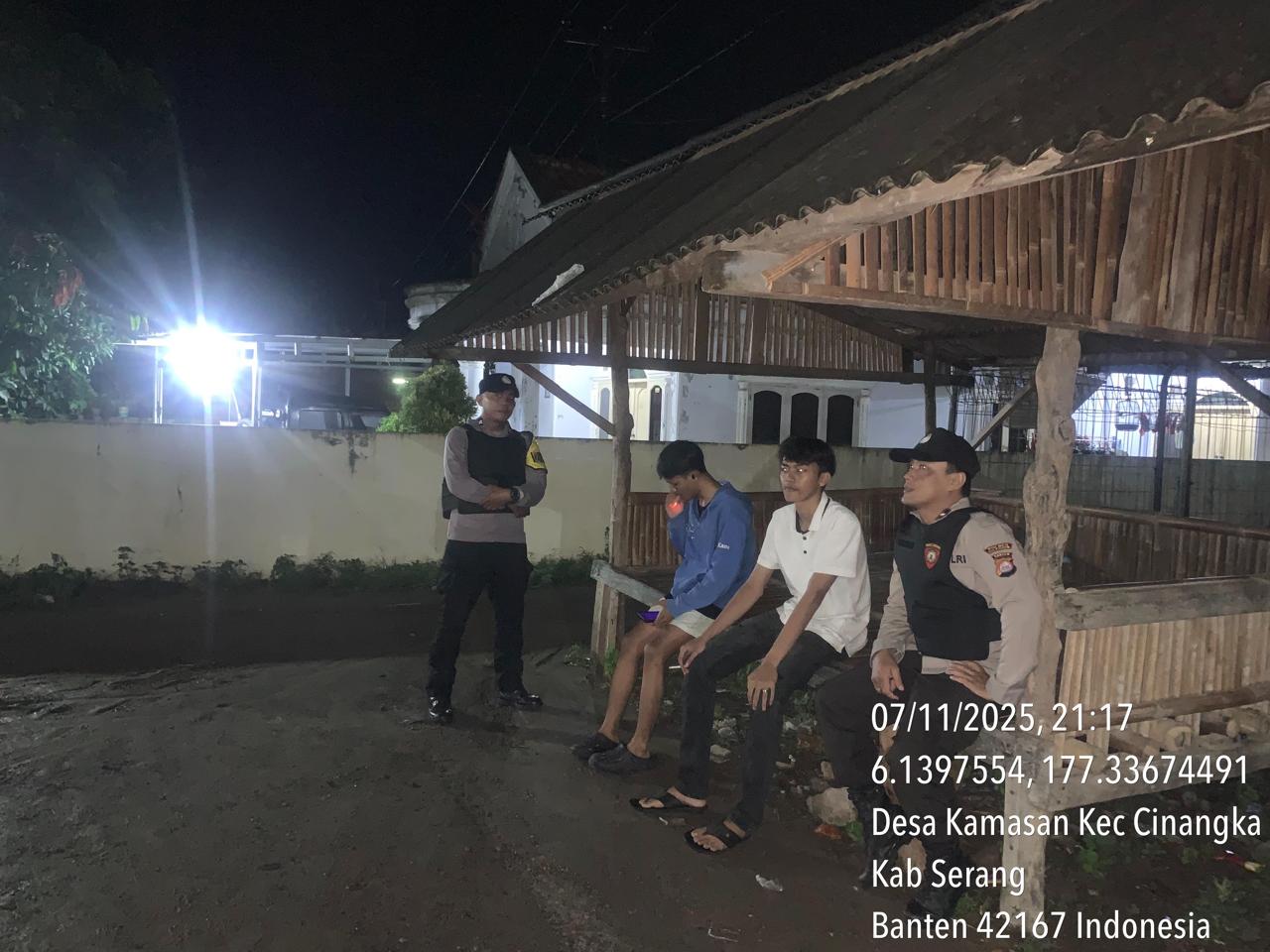 *Polres Cilegon* || Personel Bhabinkamtibmas Polsek Cinangka melaksanakan Program Komandan Wish Kapolda Banten RONDA SATKAMLING menyampaikan komunikasi dengan Petugas Siskamling agar berperan aktif dalam menciptakan Harkamtibmas yang aman dan Kondusif, Sabtu (08/11/2025).