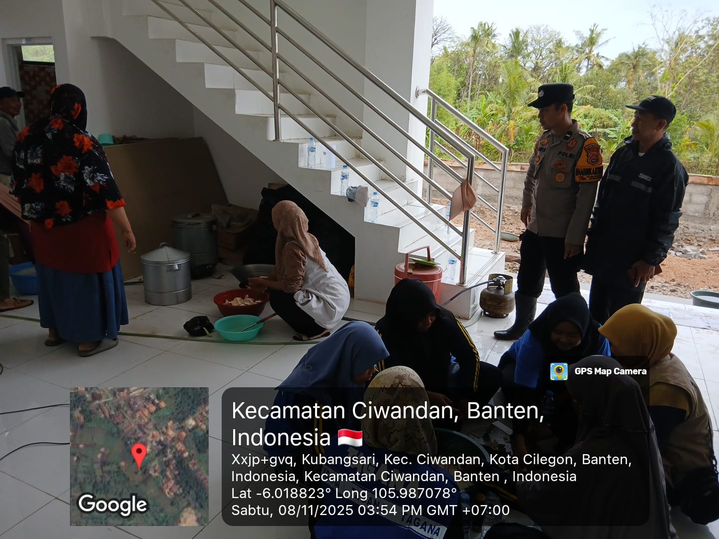 Cilegon - Bhabinkamtibmas Dan Lurah Kubangsari Mengecek Dapur Umum untuk Masyarakat Yang Terdampak Genangan Air pukul 16.07 WIB di lingkungan Cigading pasar Rt 01/02 Kelurahan Kubangsari Kecamatan Ciwandan, Sabtu (08/11/2025).