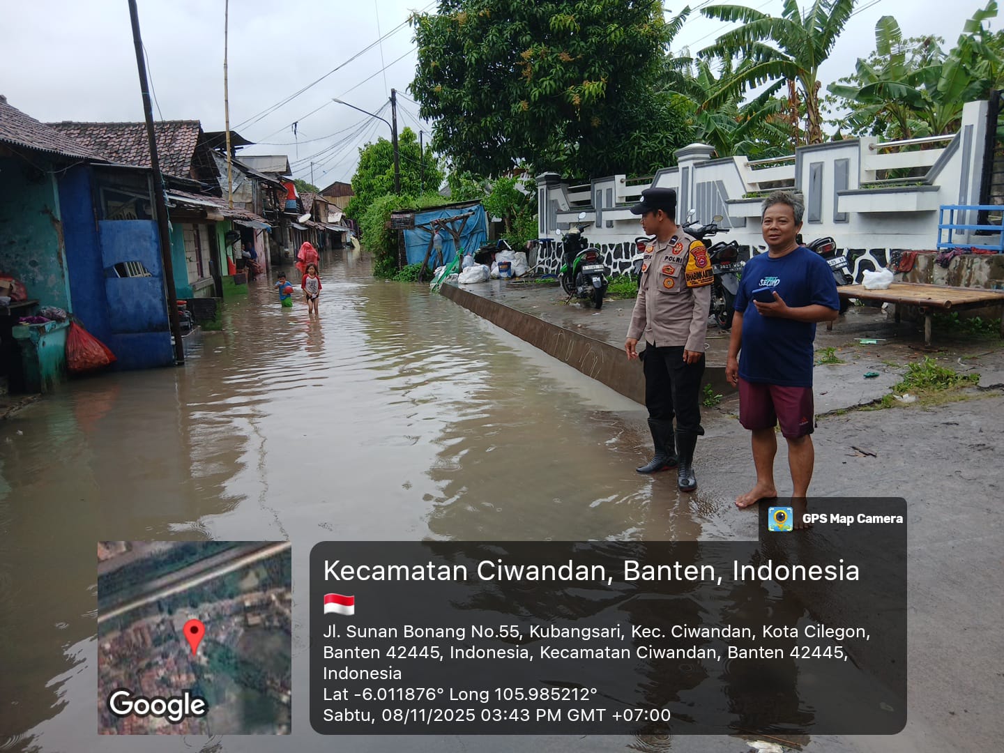 Cilegon - Bhabinkamtibmas Dan Lurah Kubangsari Mengecek Dapur Umum untuk Masyarakat Yang Terdampak Genangan Air pukul 16.07 WIB di lingkungan Cigading pasar Rt 01/02 Kelurahan Kubangsari Kecamatan Ciwandan, Sabtu (08/11/2025).