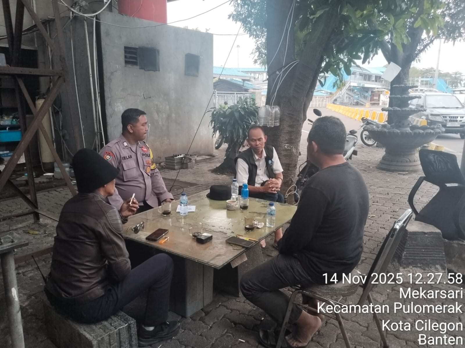 Cilegon - Personel Polsek Kskp Merak Polres Cilegon Polda Banten melaksanakan sambang dan patroli kawasan pelabuhan merak dalam rangka menjaga Harkamtibmas di Kawasan Pelabuhan Merak, Jumat (14/11/2025).