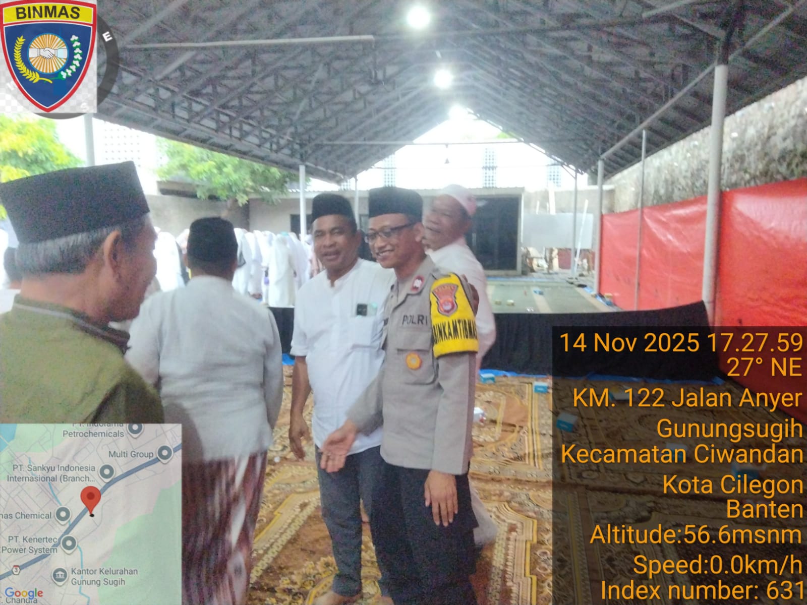 Cilegon - Bhabinkamtibmas Polsek Ciwandan Polres Cilegon Polda Banten menghadiri kegiatan Doa Bersama dan Dilanjutkan Pengajian Rutin dilingkungan Kelurahan Gunung Sugih Kecamatan Ciwandan Kota Cilegon, Jum’at (14/11/2025).