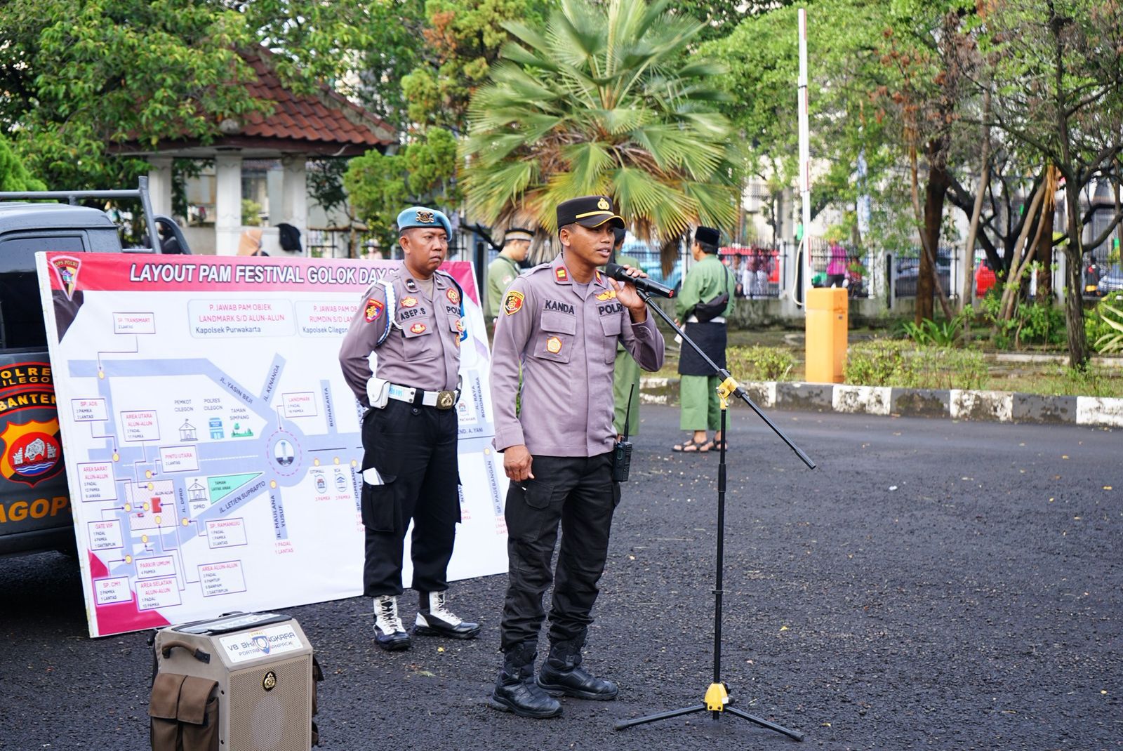 -POLRES CILEGON–Polda Banten. Kapolsek Purwakarta memimpin apel pengamanan Festival Seni Budaya Golok Day tahun 2025 yang berlangsung di rumah dinas Walikota dan Alun-alun Kota Cilegon. Apel ini diadakan untuk memastikan keamanan dan kelancaran acara yang dihadiri oleh sejumlah tokoh penting dan masyarakat umum.