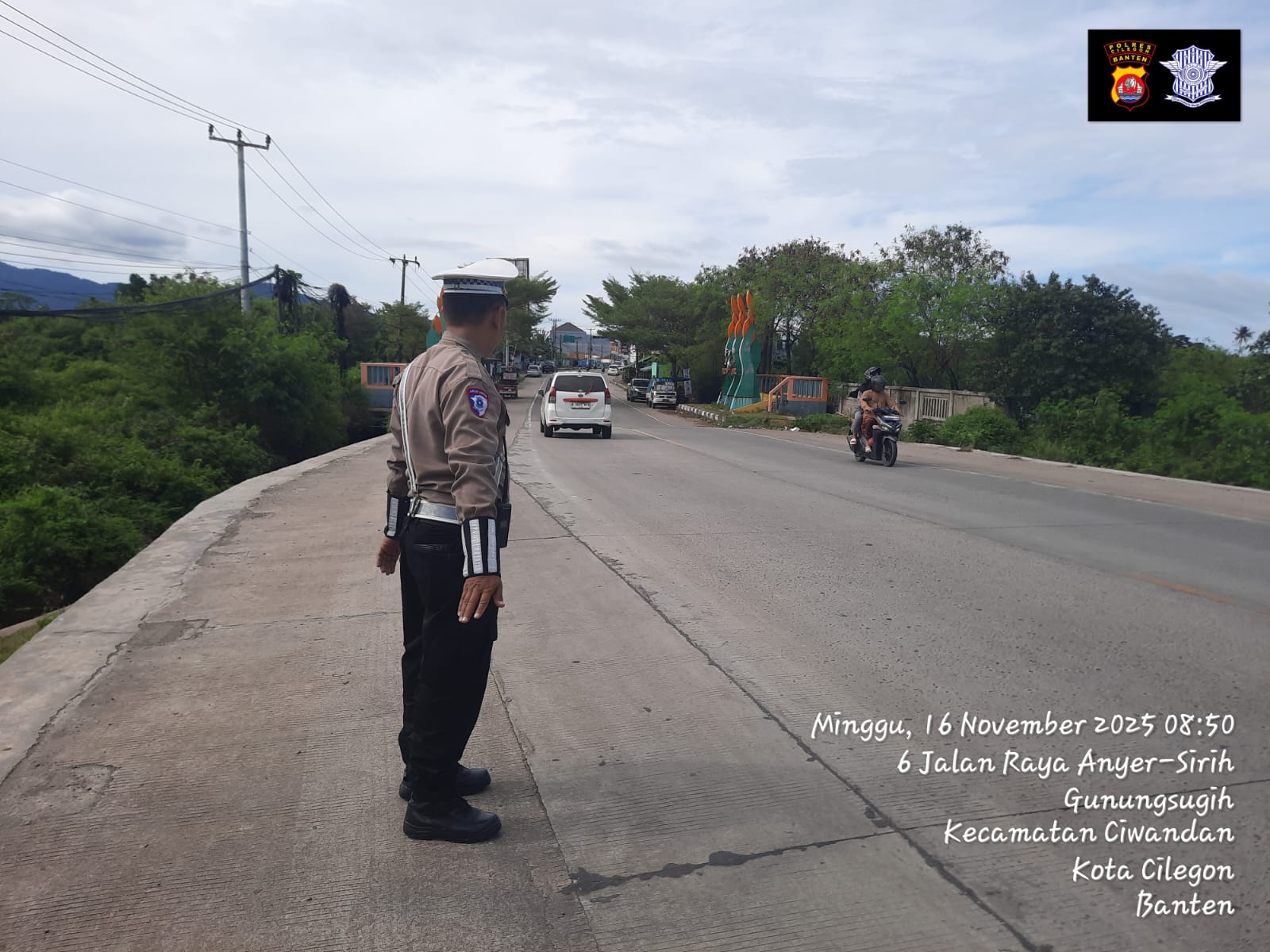 Cilegon - Personil Unit Lantas Polsek Ciwandan Polres Cilegon Polda Banten melaksanakan kegiatan monitoring jalur wisata di depan Pos Lantas JLS Ciwandan, Minggu, (16/11/2025).