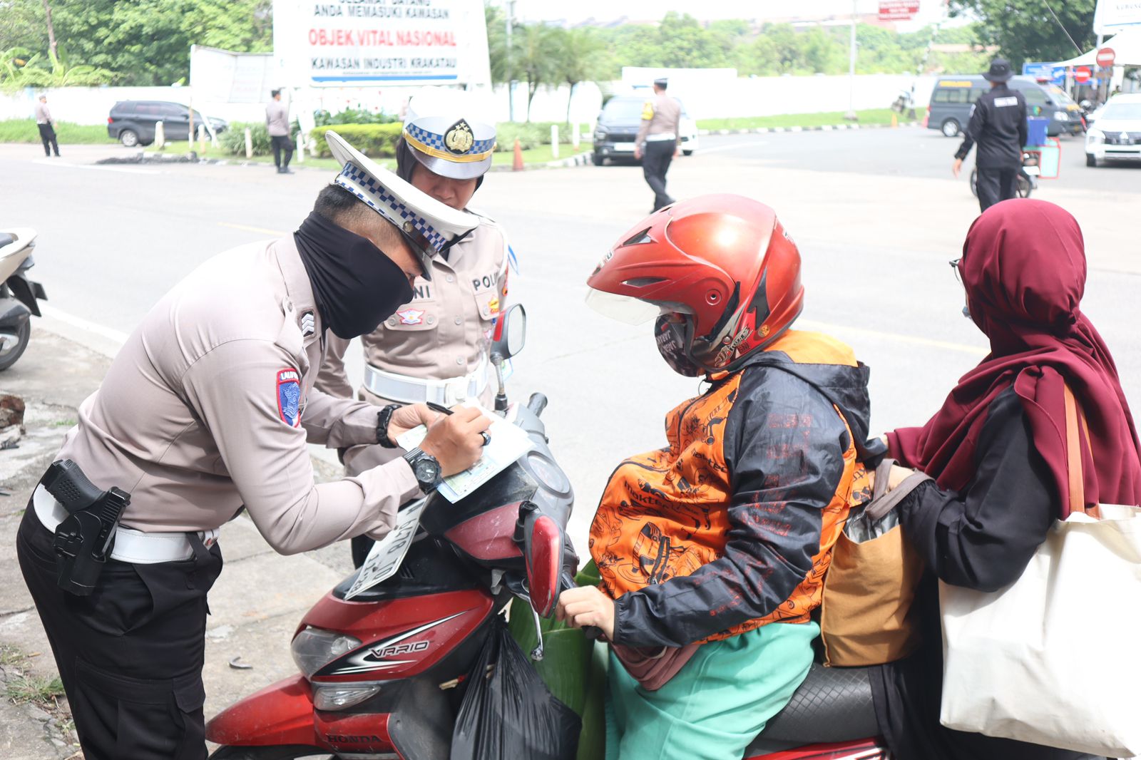 Petugas kemudian membagikan leaflet dan menempelkan stiker imbauan keselamatan kepada pengguna jalan yang melintas. Edukasi langsung juga diberikan, terutama kepada para pengendara roda dua yang belum memahami pentingnya penggunaan helm berstandar SNI dan mematuhi peraturan dasar berkendara.