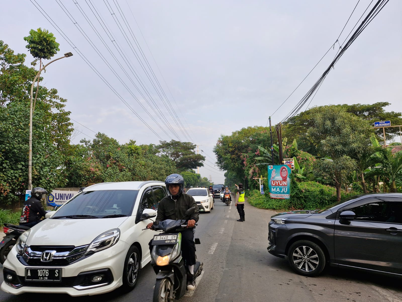 Cilegon,Polres Cilegon Polda Banten Pada Senin/24/11/2025 Pukul 06.30 Wib, Personil Siwas Polres Cilegon, Aipda Emi Prasetyo melaksanakan kegiatan pengaturan arus lalu lintas di Jalur Protokol jalan utama Kota Cilegon tepat nya di jalur depan perumahan arga baja Pura Kota Cilegon.