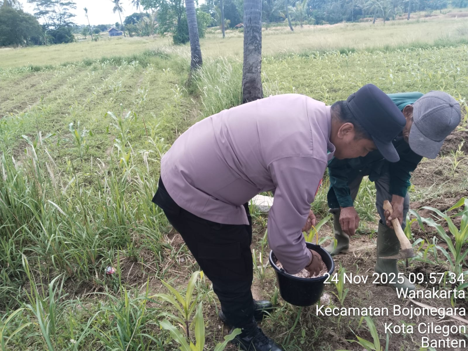Cilegon - Melaksanakan program pemerintah, penanaman jagung dalam program ketahanan pangan, personil Polsek Kp Merak Polres Cilegon Polda Banten melaksanakan kegiatan peninjauan serta monitoring lokasi yang nantinya akan ditanami bibit jagung unggul di Desa Mangkunegara Kecamatan Bojonegara, Kabupaten Serang, Senin (24/11/2025).
