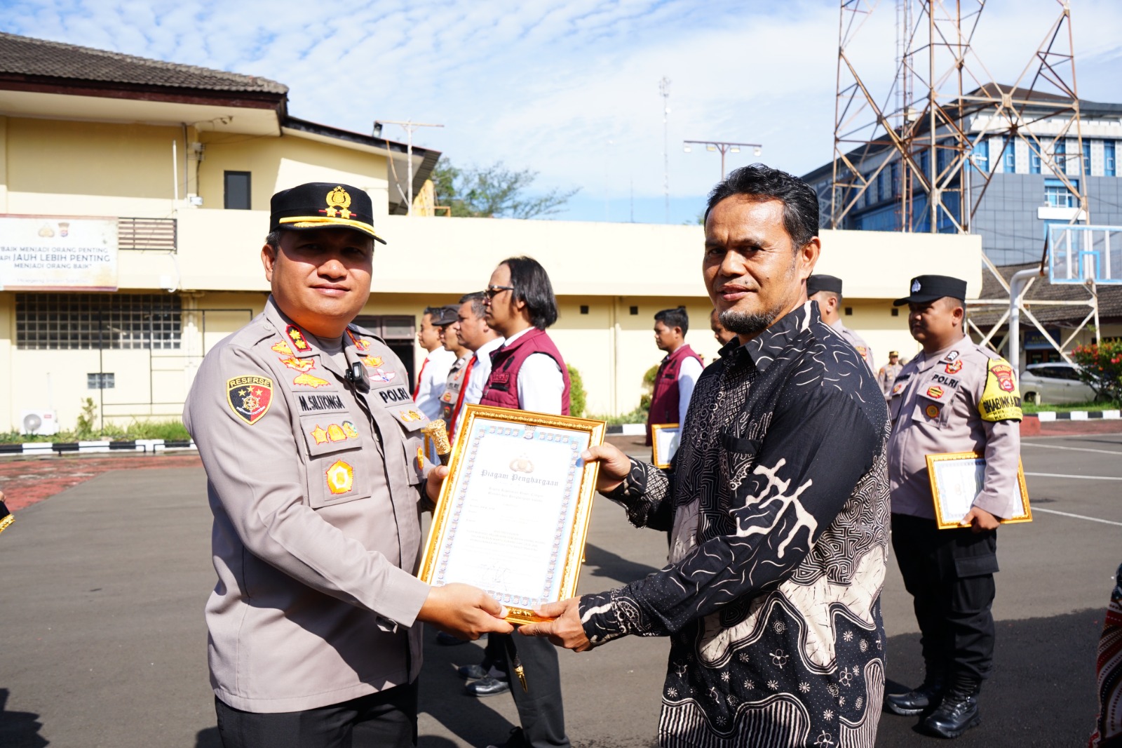 Cilegon – Polres Cilegon Polda Banten menggelar apel pemberian penghargaan kepada personel dan warga masyarakat yang berprestasi dalam membantu proses pencarian orang hilang secara cepat dan efektif. Kegiatan berlangsung di Lapangan Apel Satya Haprabu Polres Cilegon, dipimpin langsung oleh Kapolres Cilegon AKBP Dr. Martua Raja Taripar Laut Silitonga, S.H., S.I.K., M.Si. Jumat pagi (5/12/2025)