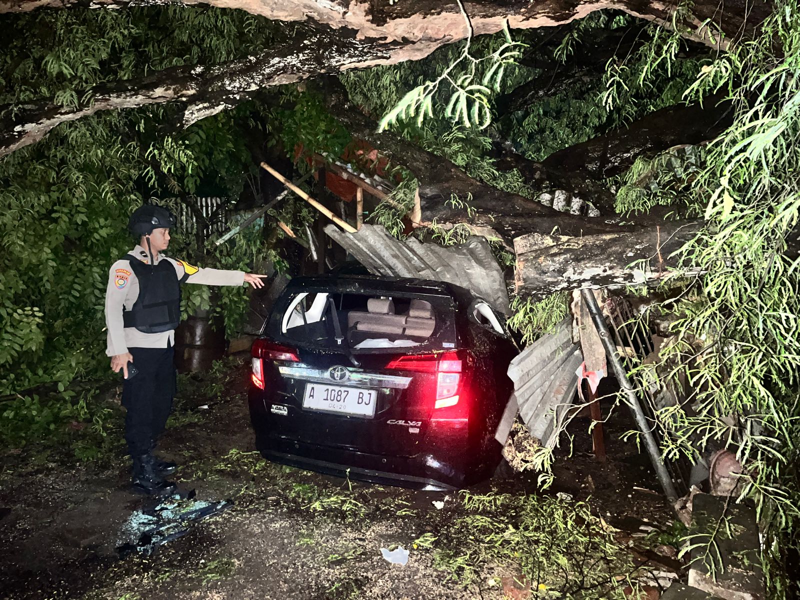 Cilegon - Pohon tumbang di Link Kubang Welut, Rt 02/04, Kel. Kubangsari, Kec. Ciwandan, Kota Cilegon, menimpa kendaraan R4 Toyota Caliya A 1087 BJ yang sedang terparkir, Selasa (16/12/2025).
