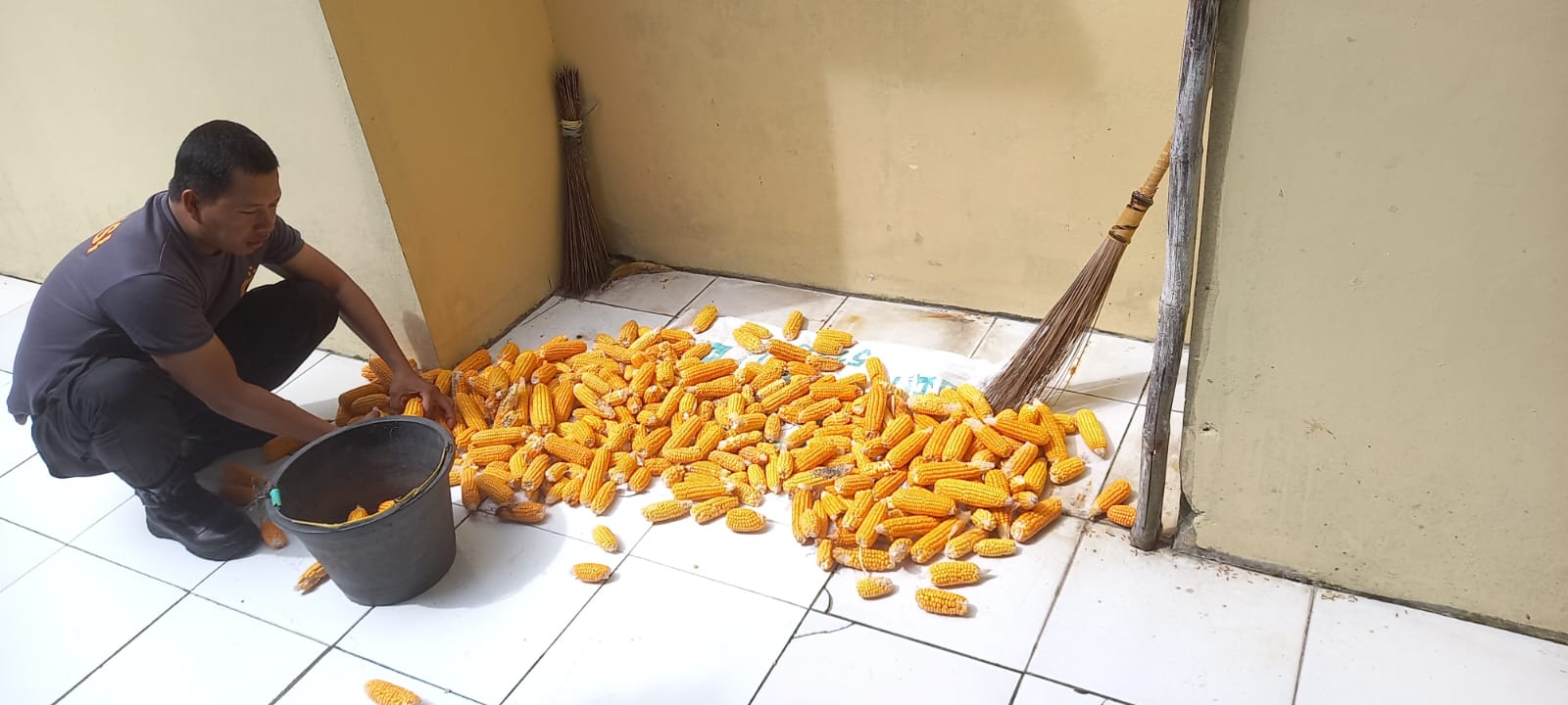 Personil Bhabinkamtibmas Kelurahan Kotabumi Polsek Purwakarta Bantu Jemur Jagung Warga Kelurahan Kotabumi