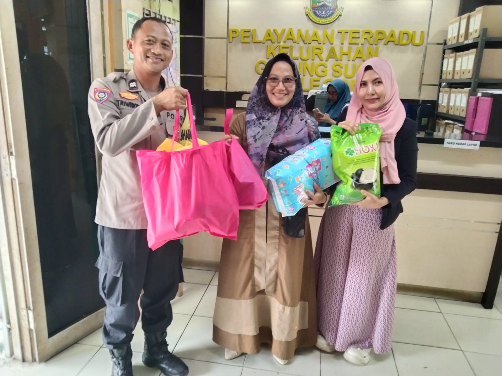 Cilegon - Bhabinkamtibmas Kel. Gunung Sugih, Aiptu Tri Widodo, mendampingi Dinsos memberikan bantuan kepada 24 warga terdampak banjir di Lingkungan Gambiran (16 warga) dan Cilodan (8 warga), Kel. Gunung Sugih, Ciwandan. Banjir terjadi akibat hujan lebat yang melanda wilayah tersebut, Jum'at (19/12/2025).