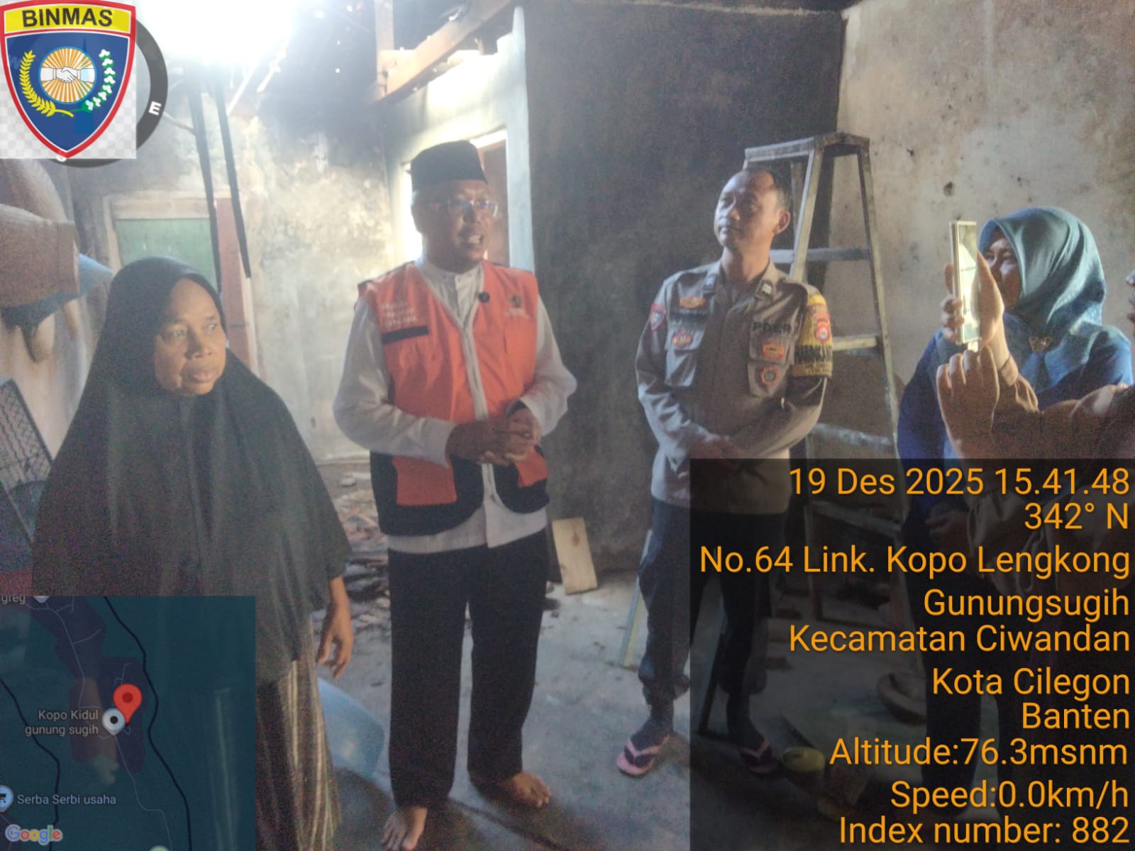 Cilegon - Bhabinkamtibmas Kelurahan Gunung Sugih AIPTU Tri Widodo, mendampingi BAZNAS Kota Cilegon memberikan bantuan kepada Ibu Junariyah, warga Link Kopo Landoh, Kel. Gunung Sugih, Ciwandan, Jum'at (19/12/2025).