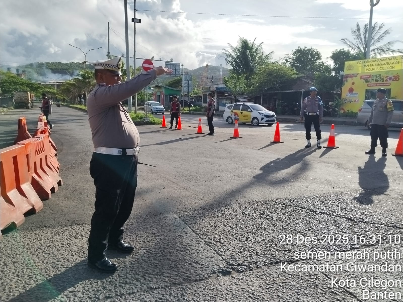 Cilegon - Guna Menciptakan kelancaran arus Lalu-Lintas Perayaan Natal Dan Tahun Baru menuju jalur wisata Anyer-Cinagka yang ada di daerah hukum Polsek Ciwandan Polres Cilegon Polda Banten,Pospam 5 Ciwandan berlakukan rekayasa Lalu lintas, Minggu (28/12/2025).