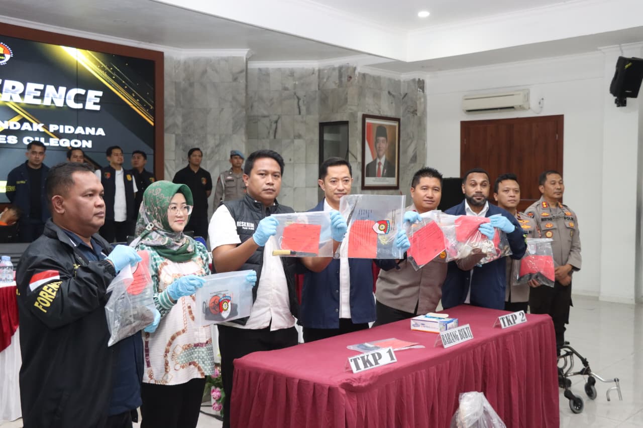 Press conference tersebut disampaikan oleh Ditreskrimum Polda Banten Kombes Pol Dian Setyawan didampingi Kapolres Cilegon AKBP Dr. Martua Raja Taripar Laut Silitonga, Plh. Kabid Humas Polda Banten AKBP Meryadi, Wakapolres Cilegon Kompol Arief Nazarudin, Kasubdit Jatanran Ditreskrimum Polda Banten Kompol Yeremia Iwo, Kasat Reskrim Polres Cilegon AKP Yoga Tama, Ka Instalasi Forensik Modikolegal RSUD Cilegon Dr. Baeti Adhayati SP FM, Puslabfor Polri Kompol Irfan Rofik.