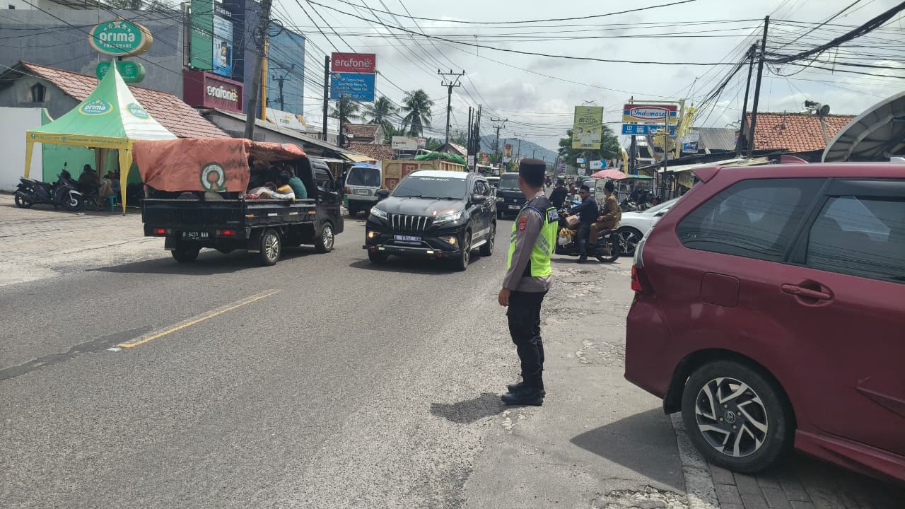 Terlihat dalam kegiatan tersebut, seorang anggota kepolisian berseragam lengkap dengan rompi pengatur lalu lintas berada di tengah jalan untuk mengatur pergerakan kendaraan roda dua maupun roda empat. Aktivitas ini dilakukan di kawasan yang ramai dilalui masyarakat, baik kendaraan pribadi, angkutan barang, maupun sepeda motor.