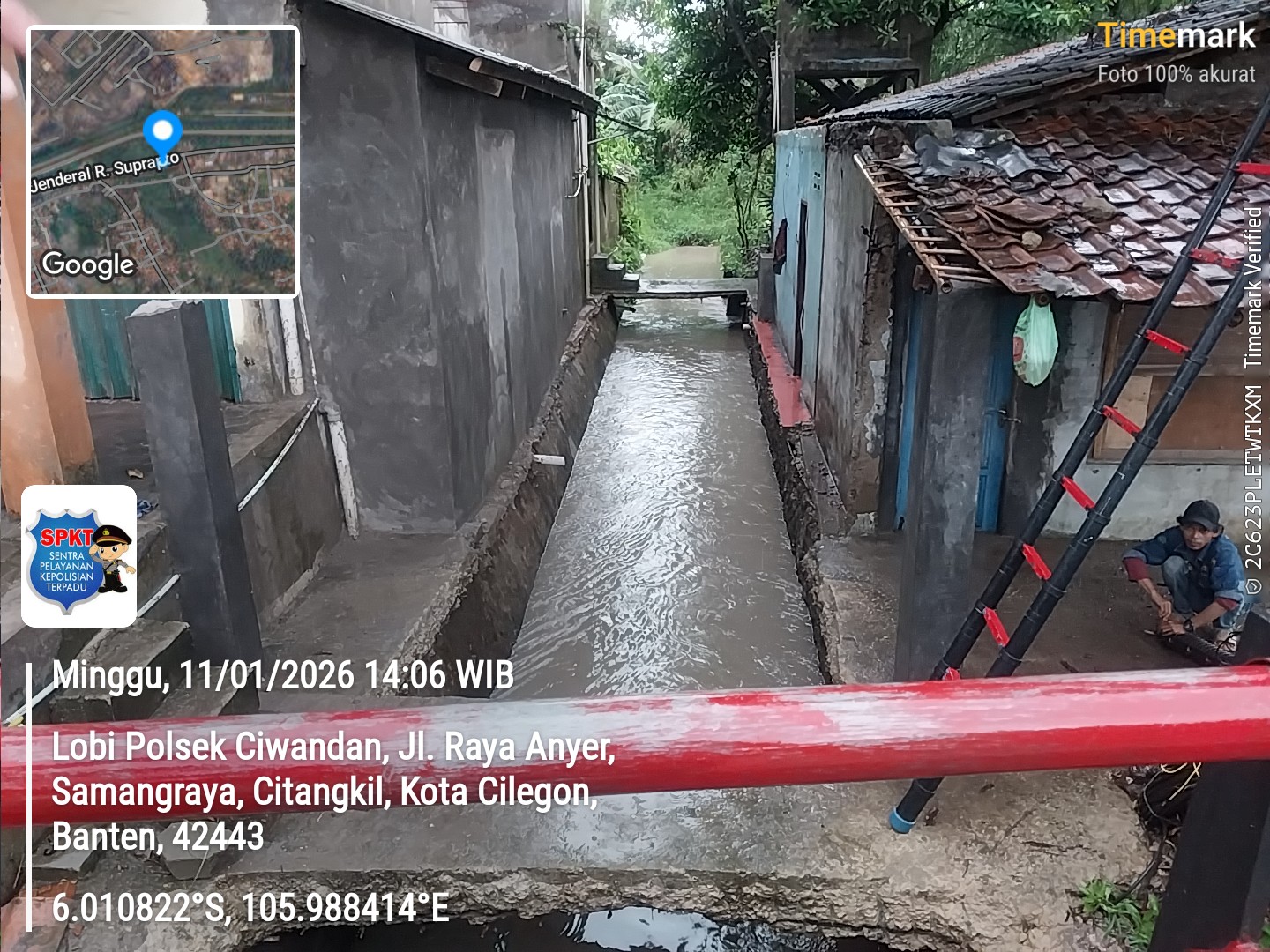 Cilegon - Dalam rangka antisipasi bencana alam personil Polsek ciwandan mengecek debit air di beberapa titik aliran sungai salah satunya yaitu kalimuk RT 005 RW 006 Kelurahan samang Raya Kecamatan citangkil Kota Cilegon, Minggu (11/01/2026).