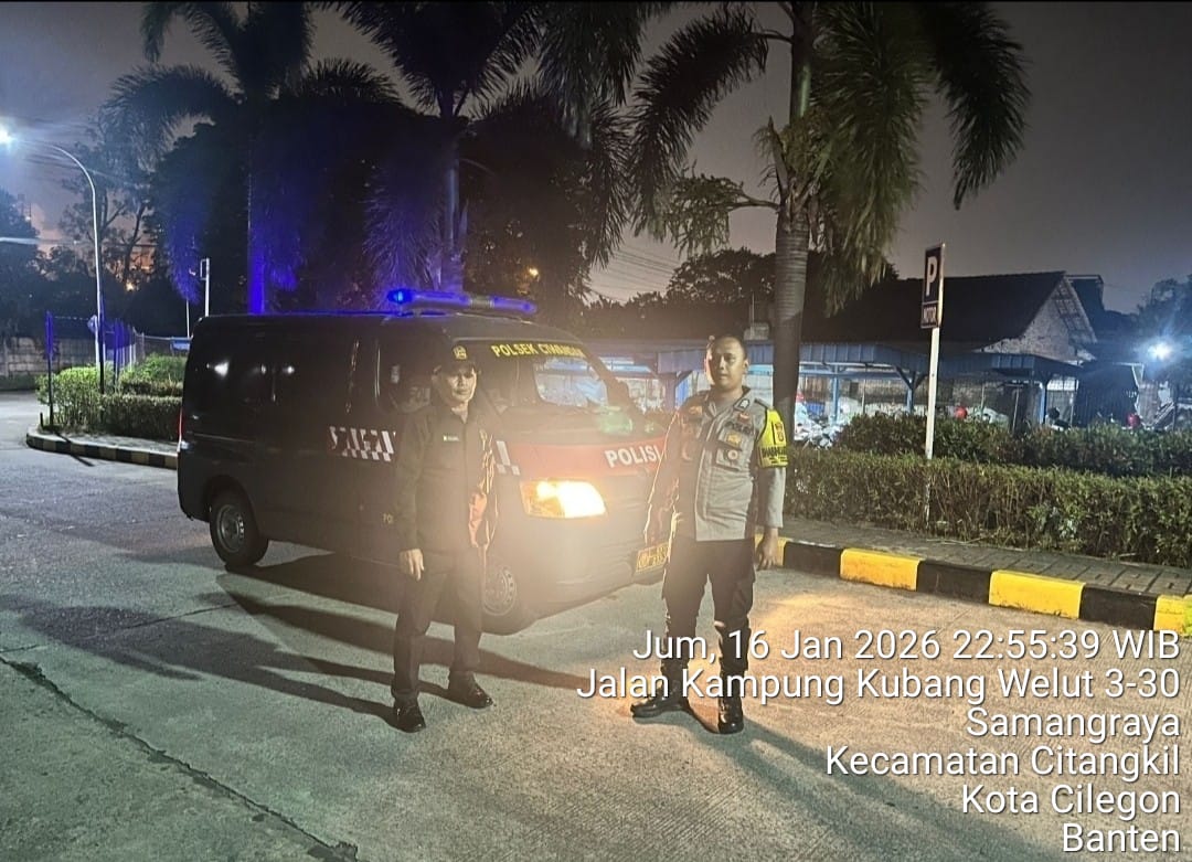 Cilegon - Personil Polsek Ciwandan Polres Cilegon Polda Banten Dalam Pelaksanaan Kegiatan Patroli dengan menyalakan lampu rotator berwarna biru di Daerah Hukum Polsek Ciwandan Polres Cilegon Polda Banten dari malam hingga dini hari, dalam rangka menciptakan situasi aman dan kondusif, Sabtu (17/01/2026).