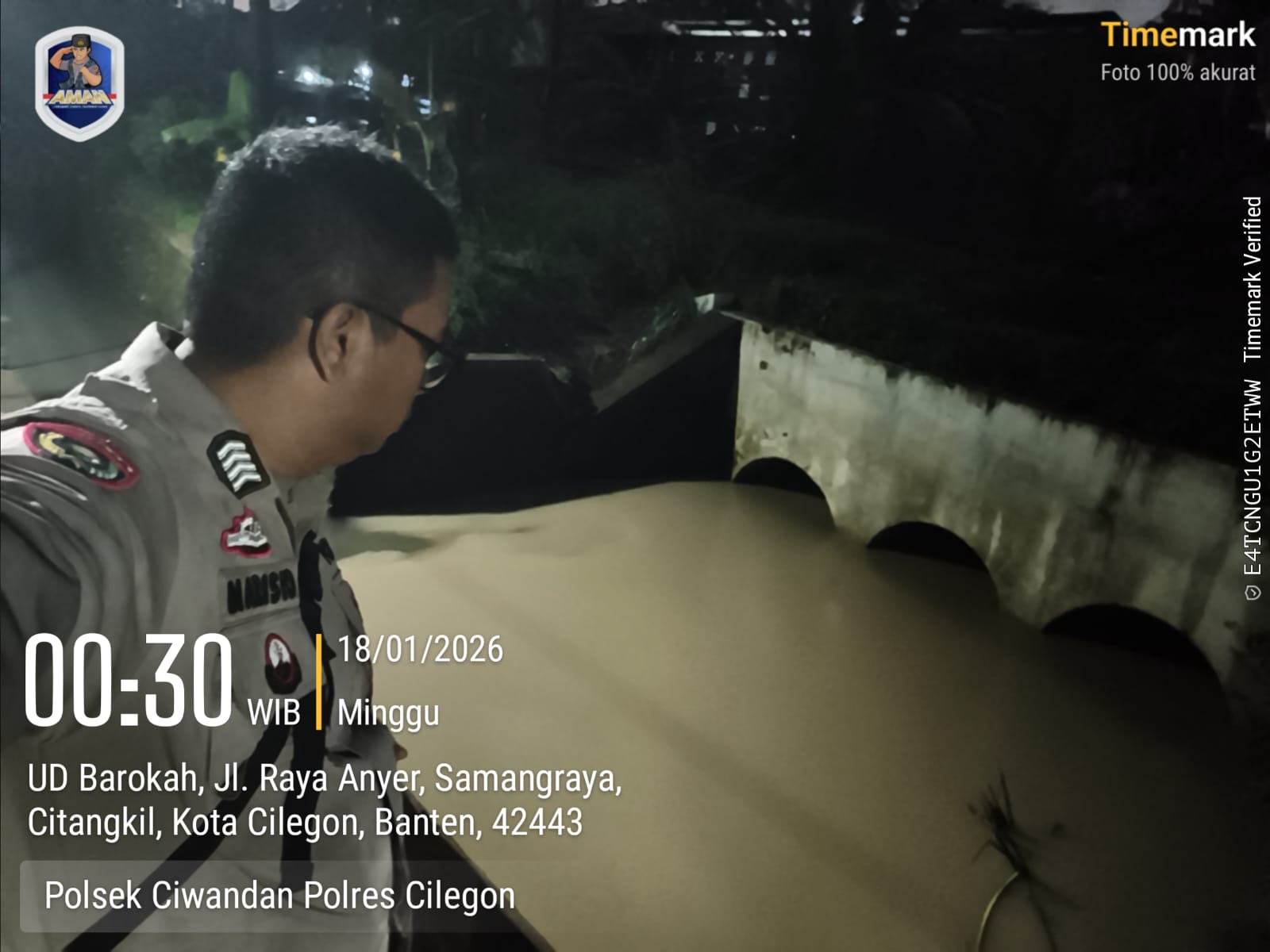 Cilegon - Dalam rangka antisipasi bencana alam personil Polsek ciwandan mengecek debit air di beberapa titik aliran sungai salah satunya yaitu kalimuk RT 005 RW 006 Kelurahan samang Raya Kecamatan citangkil Kota Cilegon, Sabtu (17/01/2026).