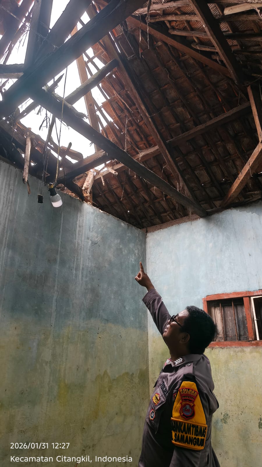 Pada pukul 12.00 WIB, Petugas Bhabinkamtibmas mendapatkan informasi bahwa ada atap rumah roboh milik Sdri. Halunah. Petugas melakukan TPTKP dan diketahui bahwa atap rumah area tengah roboh, namun tidak ada korban jiwa dalam kejadian tersebut. Rumah tersebut dihuni oleh 3 orang.