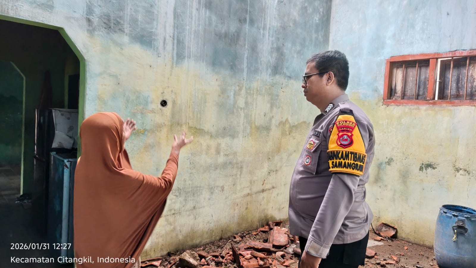 Pada pukul 12.00 WIB, Petugas Bhabinkamtibmas mendapatkan informasi bahwa ada atap rumah roboh milik Sdri. Halunah. Petugas melakukan TPTKP dan diketahui bahwa atap rumah area tengah roboh, namun tidak ada korban jiwa dalam kejadian tersebut. Rumah tersebut dihuni oleh 3 orang.