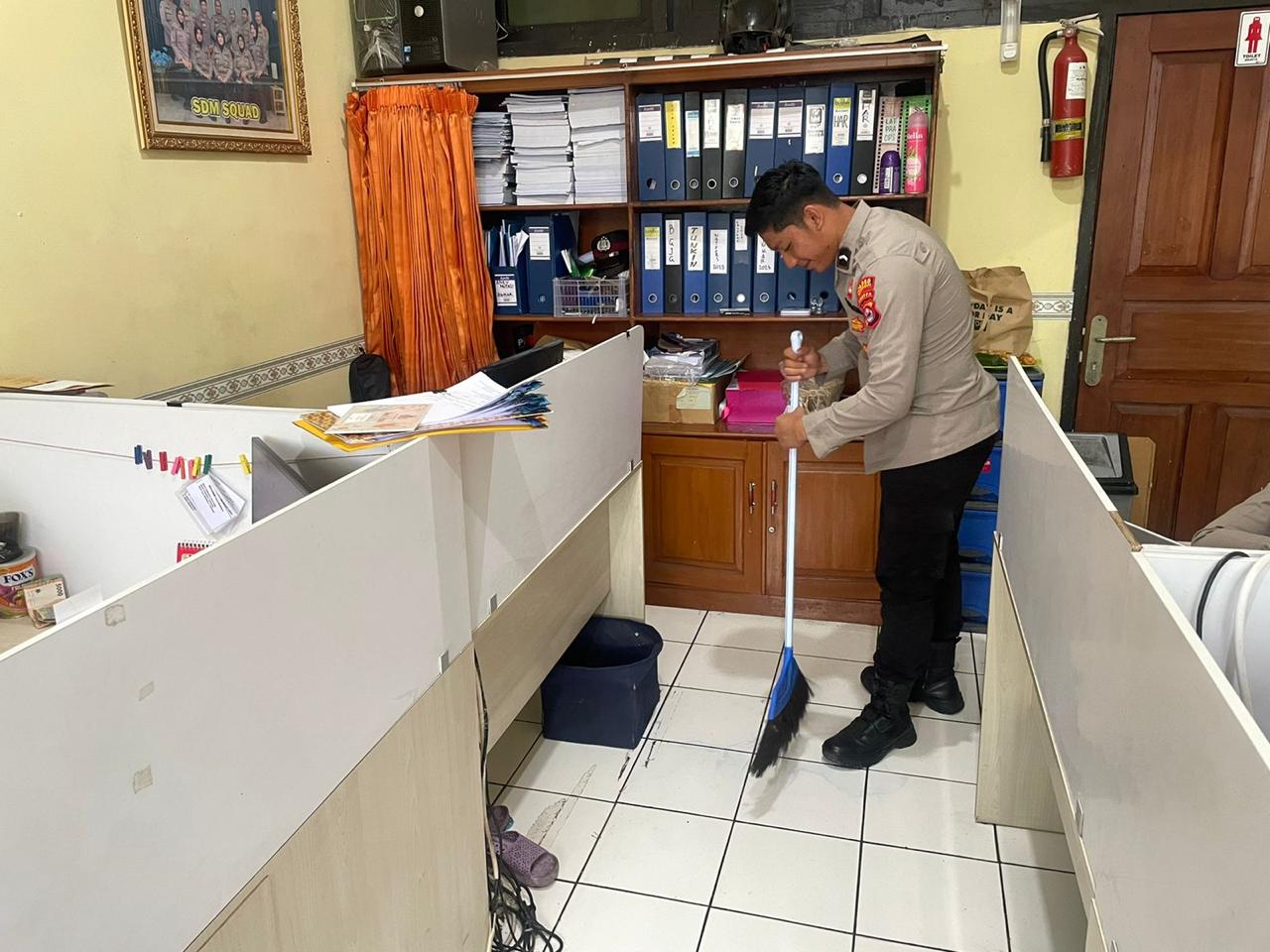 Anggota Bag SDM Polres Cilegon, melaksankan kegiatan memberrsihkan ruangan kerja secara rutinb