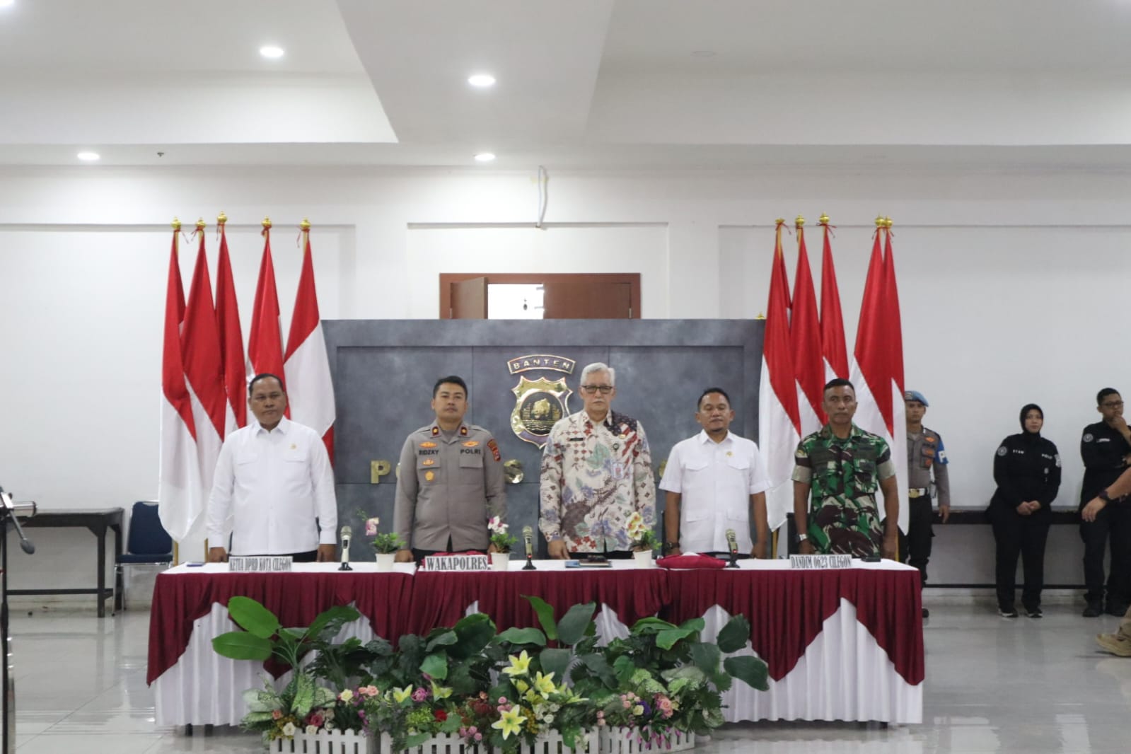 Rapat koordinasi dilaksanakan di bawah penanggung jawab Kapolres Cilegon AKBP Dr. Martua Raja Taripar Laut Silitonga, S.H., S.I.K., M.Si. Kegiatan turut dihadiri Wakapolres Cilegon KOMPOL M. Ridzky Salatun, S.I.K., Wakil Ketua I DPRD Kota Cilegon H. Sohidin, S.H., Wakil Ketua II DPRD Kota Cilegon H. Masduki, Asda II Kota Cilegon H. Dana Sujaksani, S.Sos., M.Si., Danramil Cilegon Mayor Inf Usman, Plt Kadis Ketahanan Pangan Kota Cilegon Novi Yogi, Sekjen MUI Kota Cilegon H. Sutisna Abas, Ketua MUI Kabupaten Serang H. Muhit, Ketua FKUB Kabupaten Serang KH. Komarudin, Head Operation ASDP Merak I Putu Widhiyatamaja, Jr Officer Sc PT Pertamina Tanjung Gerem Achtizen, para PJU Polres Cilegon, Kapolsek jajaran Polres Cilegon, perwakilan SKPD Kota Cilegon, pimpinan instansi terkait, serta pimpinan organisasi keagamaan.