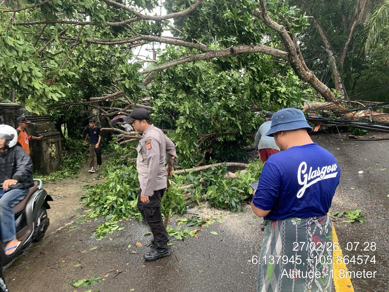 *Polres Cilegon* - di Jalan Raya Cinangka-Anyer tepatnya di Kp. Lebak Sawo Ds. Sindanglaya Kec. Cinangka Kab. Serang telah terjadi pohon tumbang yang disebabkan oleh Angin dan Pohon yang sudah berumur tua, Jumat (27/022026).