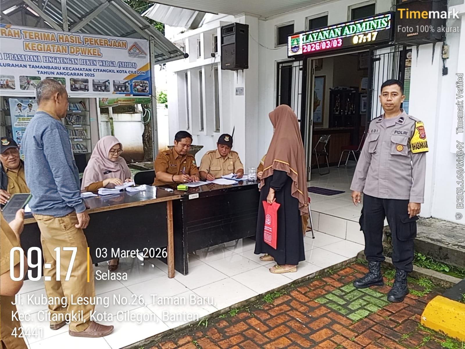 Cilegon - Bhabinkamtibmas Kelurahan Tamanbaru Polsek Ciwandan Polres Cilegon Polda Banten AIPDA Edianto, memonitor kegiatan penyerahan bantuan dari Badan Amil Zakat Nasional (Baznas) Kota Cilegon kepada anak yatim dan dhuafa di Halaman Kantor Kelurahan Tamanbaru, Kecamatan Citangkil, Kota Cilegon, Selasa (03/03/2026).
