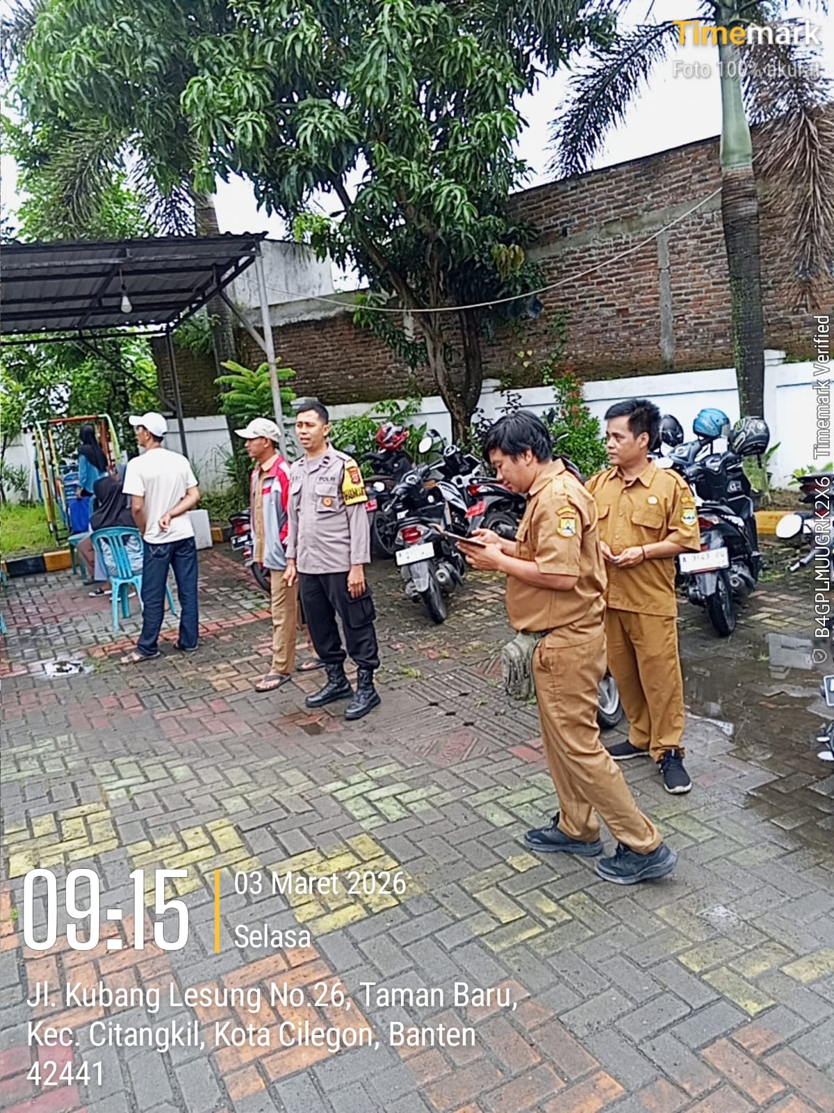 Cilegon - Bhabinkamtibmas Kelurahan Tamanbaru Polsek Ciwandan Polres Cilegon Polda Banten AIPDA Edianto, memonitor kegiatan penyerahan bantuan dari Badan Amil Zakat Nasional (Baznas) Kota Cilegon kepada anak yatim dan dhuafa di Halaman Kantor Kelurahan Tamanbaru, Kecamatan Citangkil, Kota Cilegon, Selasa (03/03/2026).