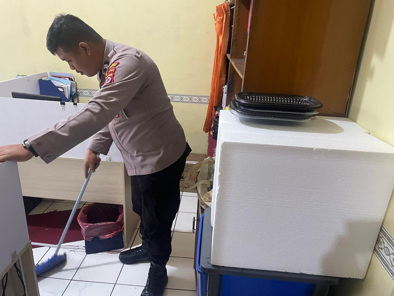 anggota SDM Polres Cilegon, aktif dalam selalu menjaga kebersian ruangan kkerja setiap saat.