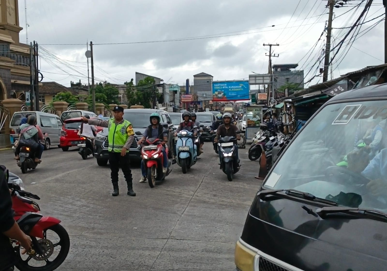 Meskipun saat hujan !!! Kanit Lantas Polsek Pulomerak Bantu atur lalin di depan SMP 3 Cilegon