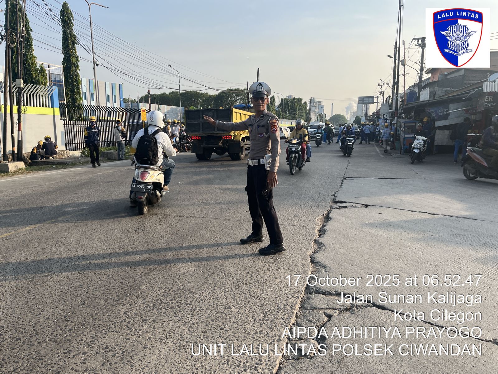 Cilegon - Personil Polsek Ciwandan Polres Cilegon Polda Banten melaksanakan giat Strong Poin Pengaturan Lalu Lintas Disimpang Brown Kelurahan Gunung Sugih guna menciptakan ketertiban, keamanan dan Kelancaran Lalu-lintas bagi masyarakat, Jum’at (17/10/2025).