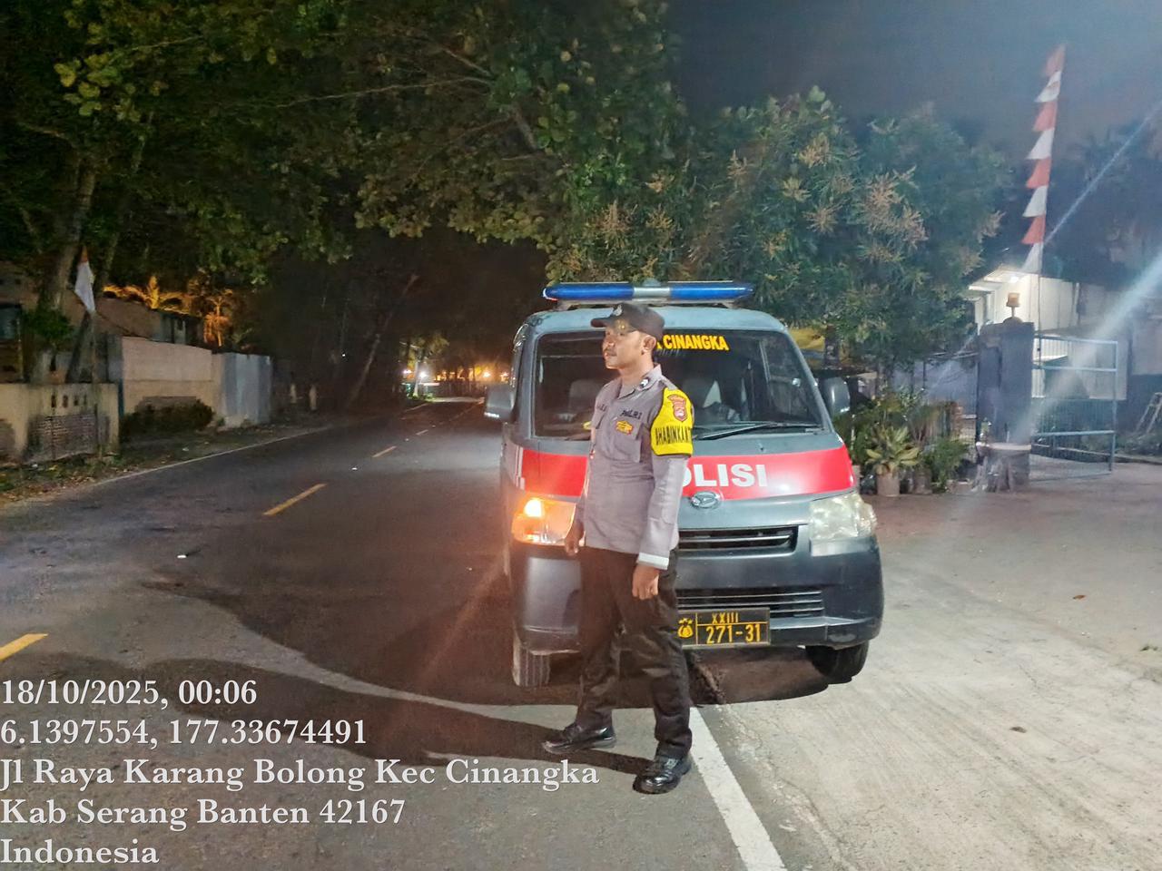 *Cilegon* – Dalam Rangka Pencegahan Kejahatan Jalanan dan Memelihara situasi keamanan dan menjaga serta memberikan rasa aman dan nyaman di masyarakat,Salah satu upaya untuk mewujudkan hal tersebut sebagaimana yang dilakukan oleh Personil Polsek Cinangka Polres Cilegon Polda Banten melaksanakan giat patroli blue light malam hari hingga menjelang pagi, Sabtu (18/10/2025).