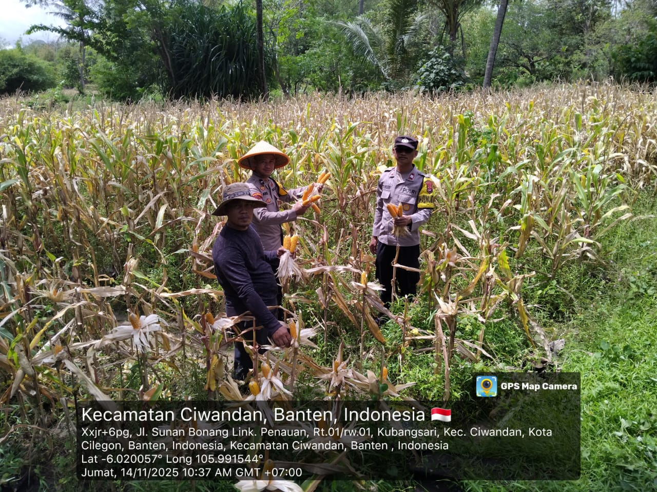 Cilegon - Polsek Ciwandan Polres Cilegon Polda Banten mendukung kegiatan panen jagung Hibrida hasil penanaman Kelompok Tani Kubang Lestari I di Kelurahan Kubangsari Kecamatan Ciwandan, Kota Cilegon, Jum’at (14/11/2025).